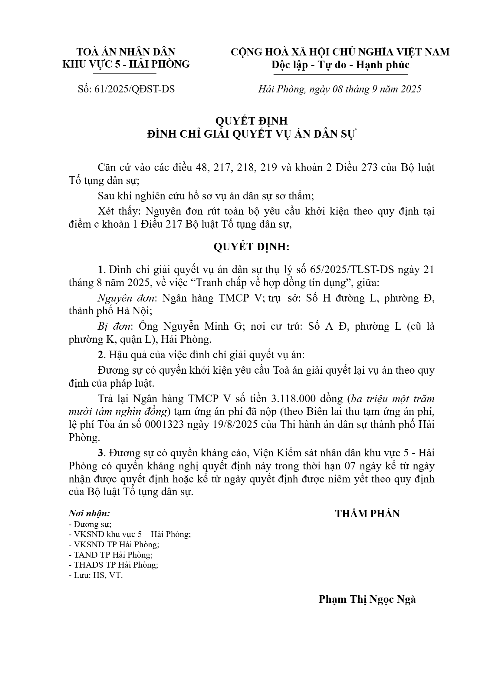 Quyết định số 61/2025/QĐST-DS ngày 08/09/2025 của Tòa án nhân dân khu vực 5 - Hải Phòng, TP. Hải Phòng về tranh chấp hợp đồng tín dụng