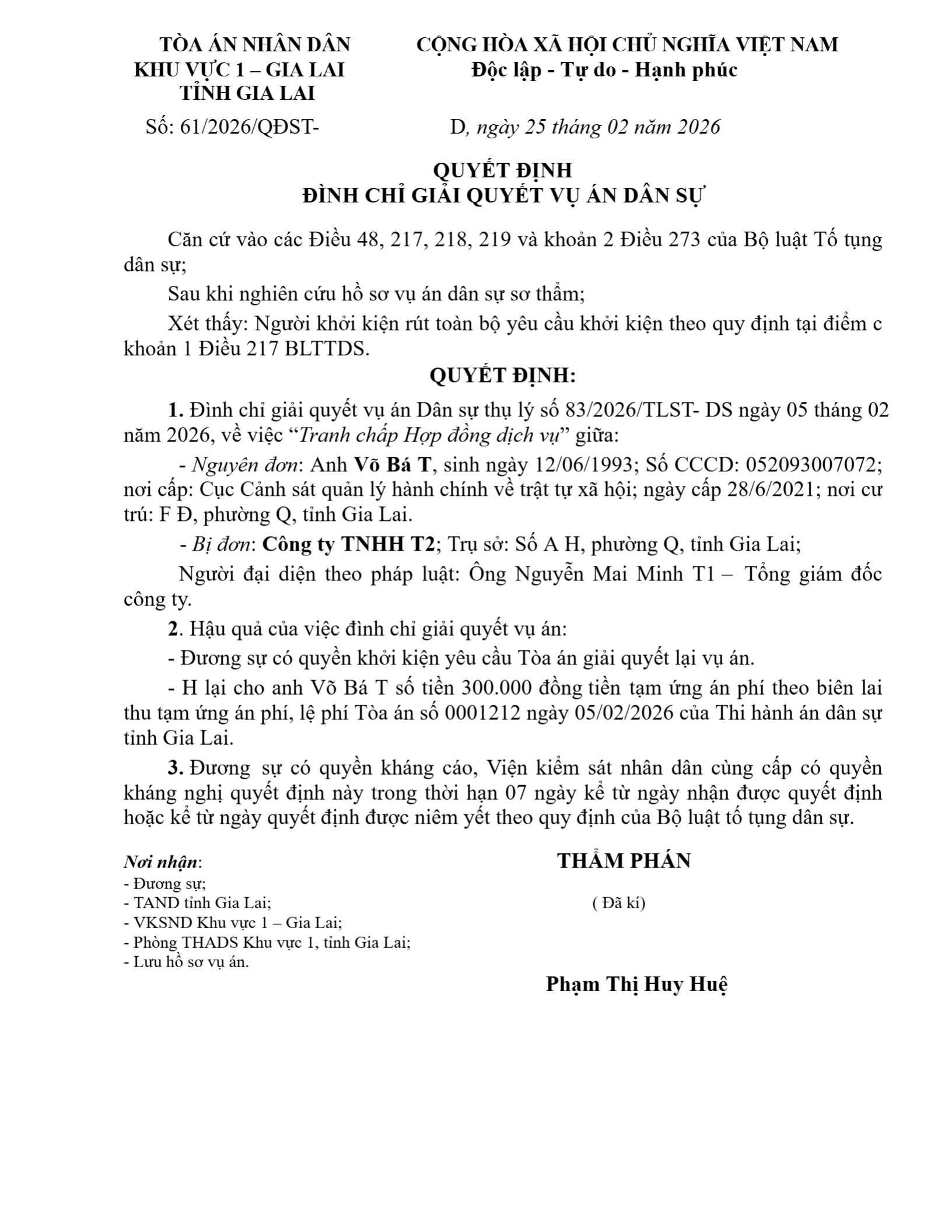 Quyết định số 61/2026/QĐST- ngày 25/02/2026 của Tòa án nhân dân khu vực 1 - Gia Lai, tỉnh Gia Lai về tranh chấp hợp đồng dịch vụ