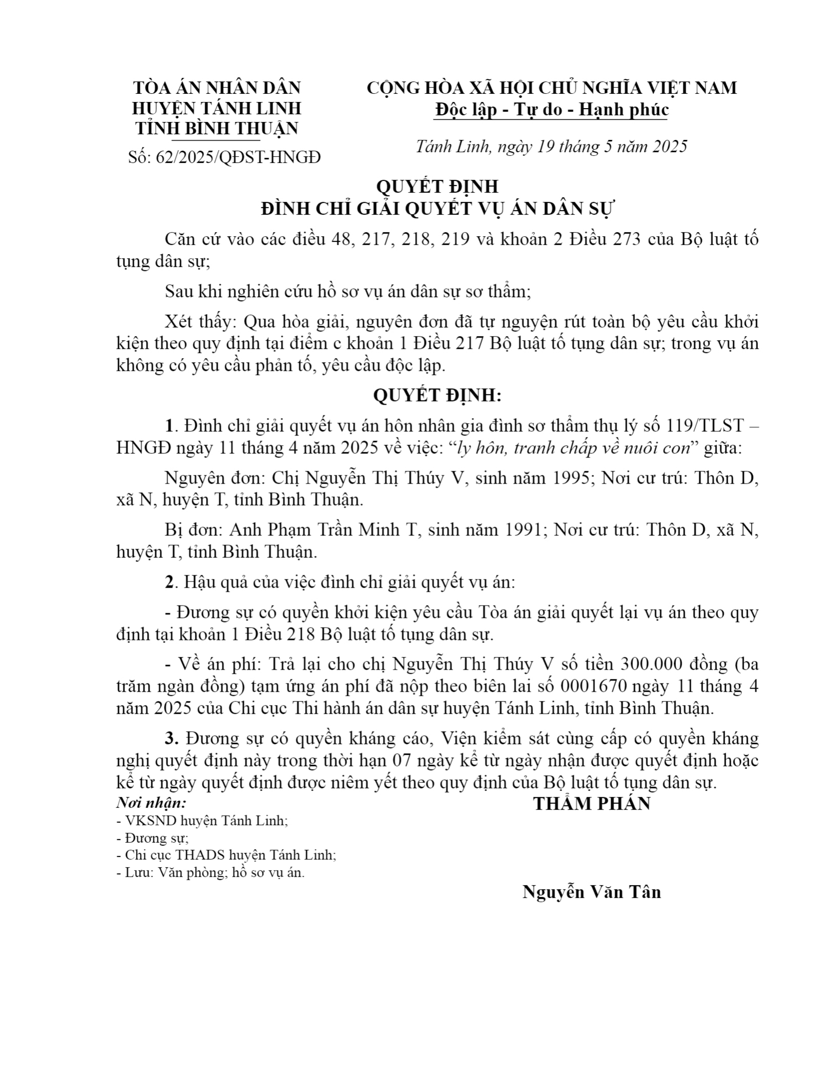 Quyết định số 62/2025/QĐST-HNGĐ ngày 19/05/2025 của TAND huyện Tánh Linh, tỉnh Bình Thuận về vụ án ly hôn về mâu thuẫn gia đình