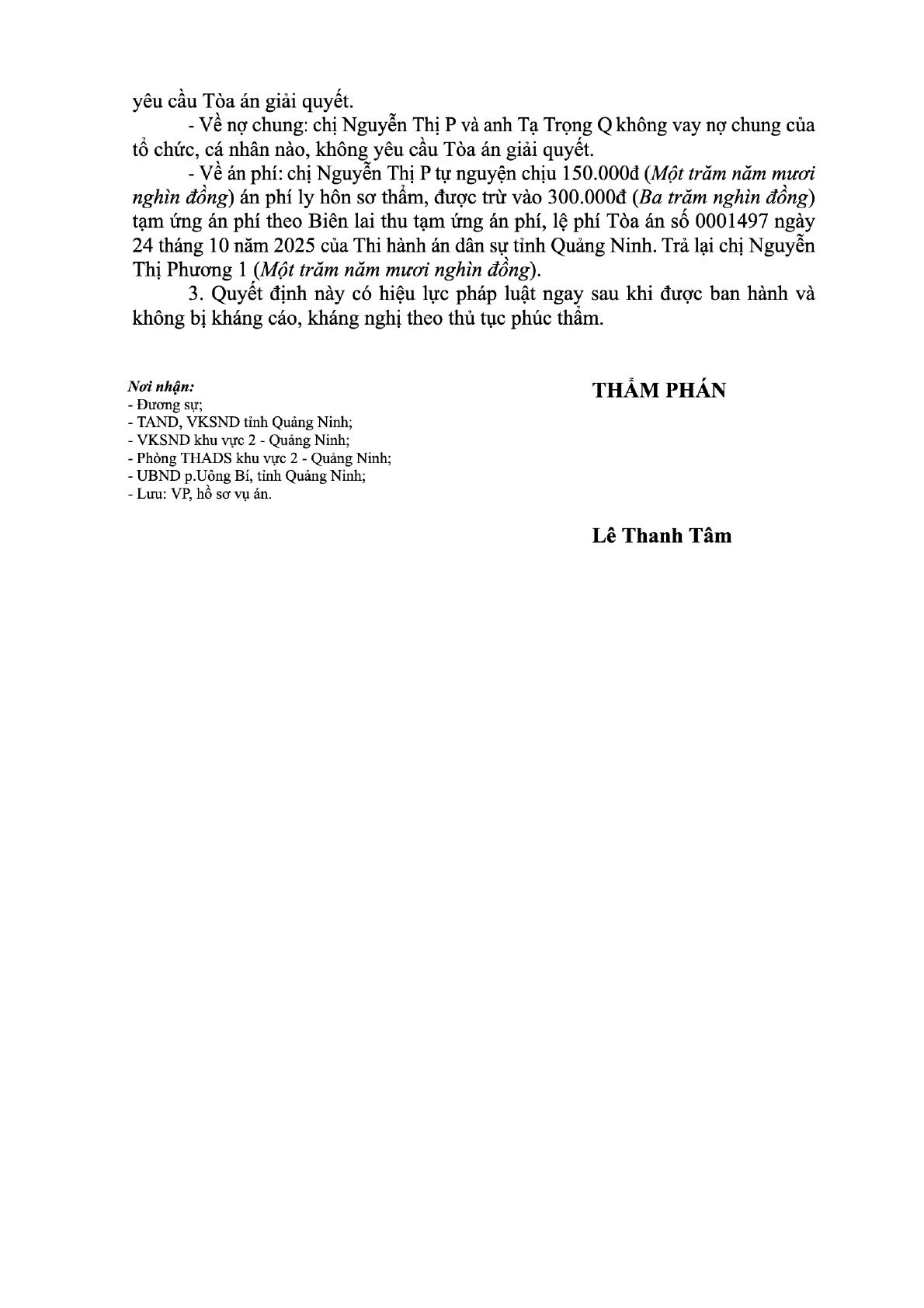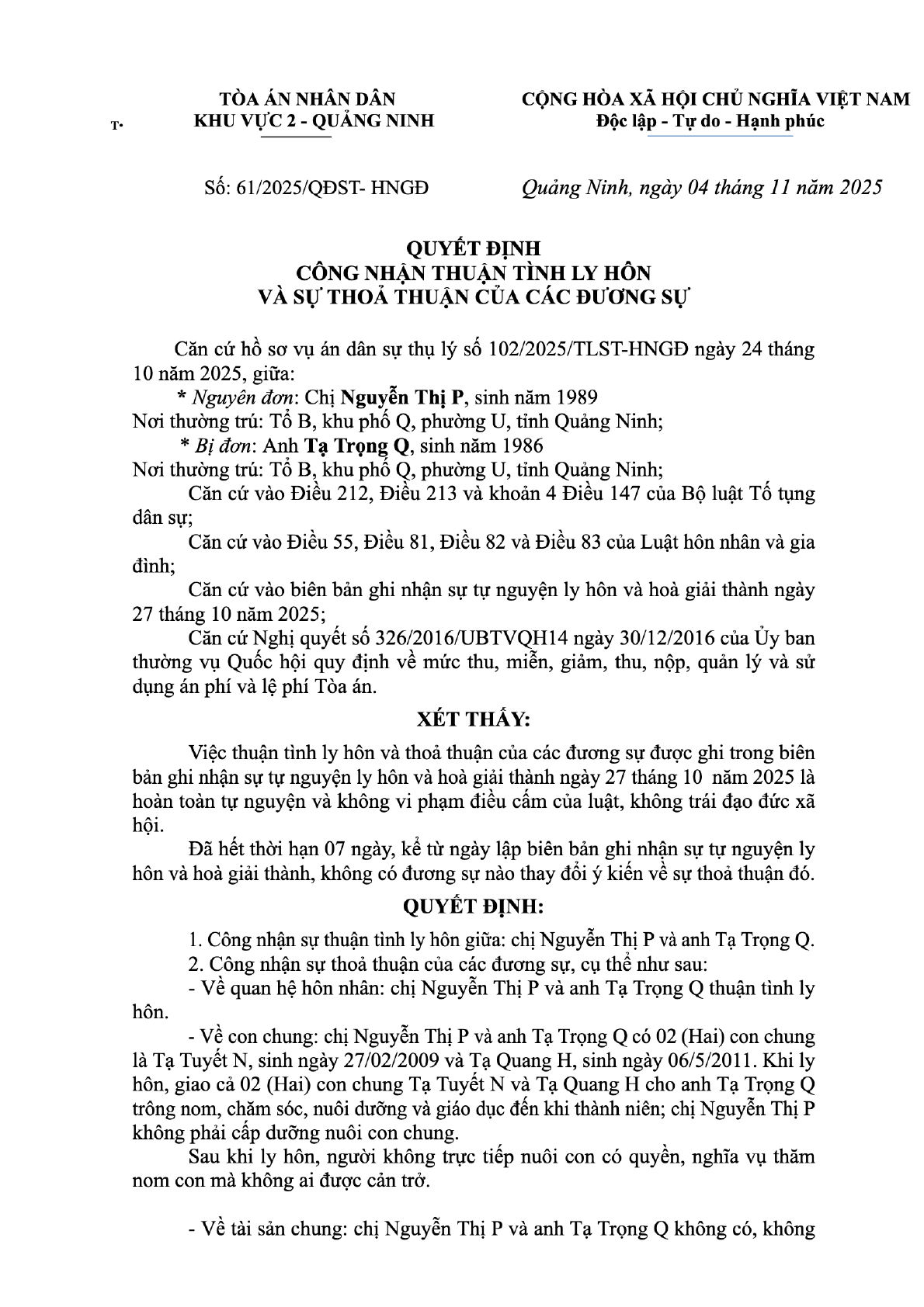 Quyết định số 62/2025/QĐST-HNGĐ ngày 04/11/2025 của Tòa án nhân dân khu vực 2 - Quảng Ninh, tỉnh Quảng Ninh về vụ án ly hôn về mâu thuẫn gia đình