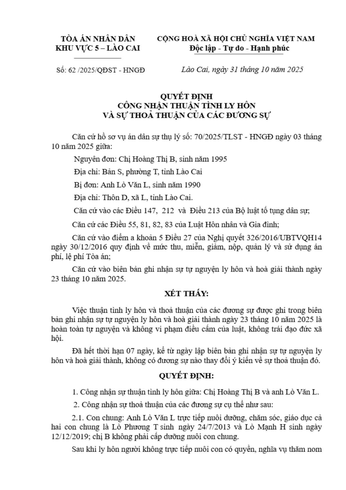 Quyết định số 62/2025/QĐST-HNGĐ ngày 31/10/2025 của Tòa án nhân dân khu vực 5 - Lào Cai, tỉnh Lào Cai về vụ án ly hôn về mâu thuẫn gia đình