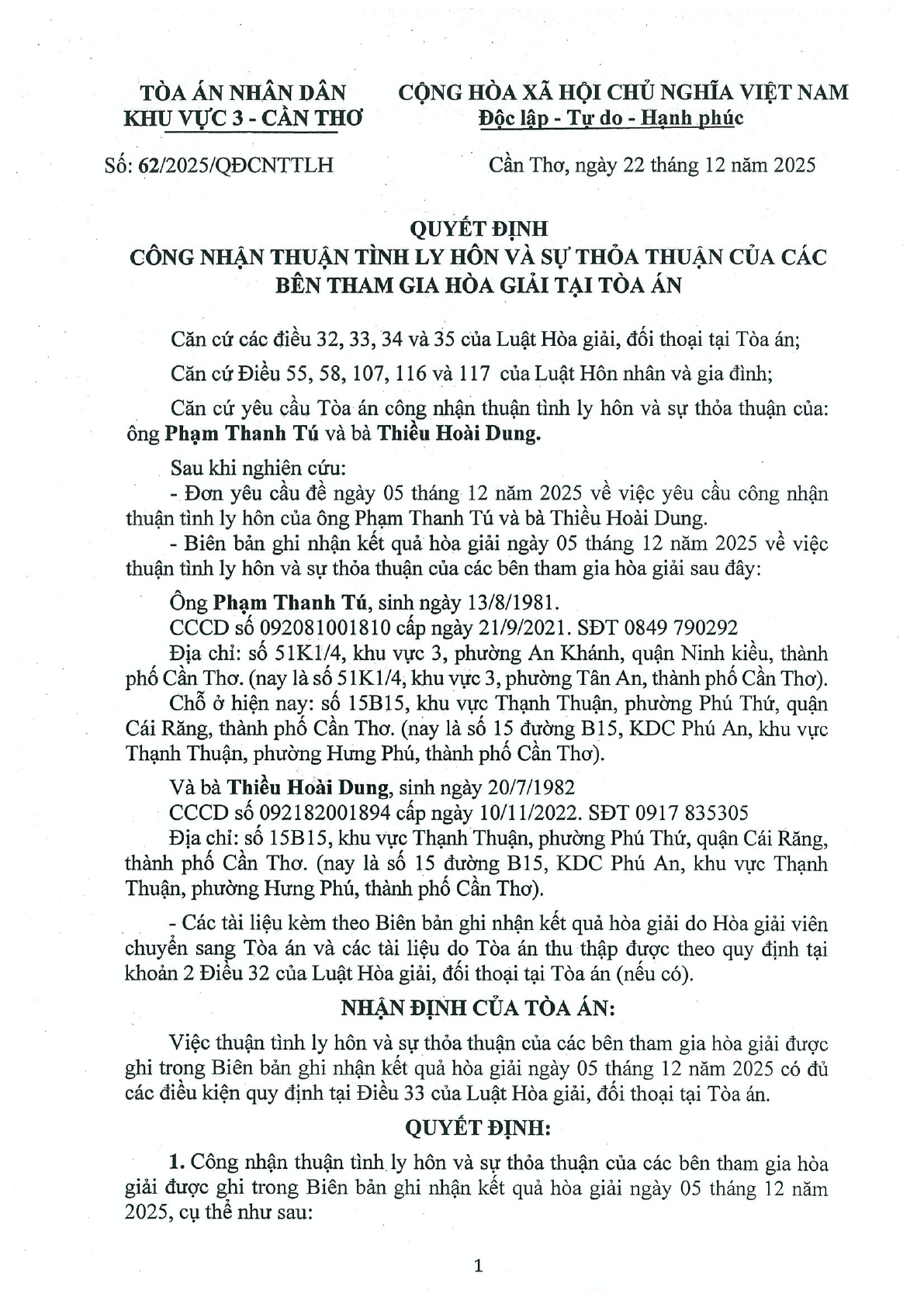 | Tên Quyết định: | Quyết định số 62/2025/QĐST-HNGĐ ngày 22/12/2025 của Tòa án nhân dân khu vực 3 - Cần Thơ, TP. Cần Thơ về vụ án ly hôn về mâu thuẫn gia đình |