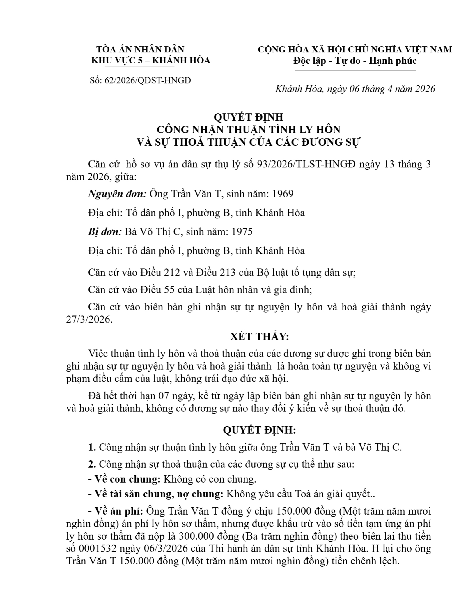 Quyết định số 62/2026/QĐST-HNGĐ ngày 06/04/2026 của Tòa án nhân dân khu vực 5 - Khánh Hòa, tỉnh Khánh Hòa về vụ án ly hôn về mâu thuẫn gia đình