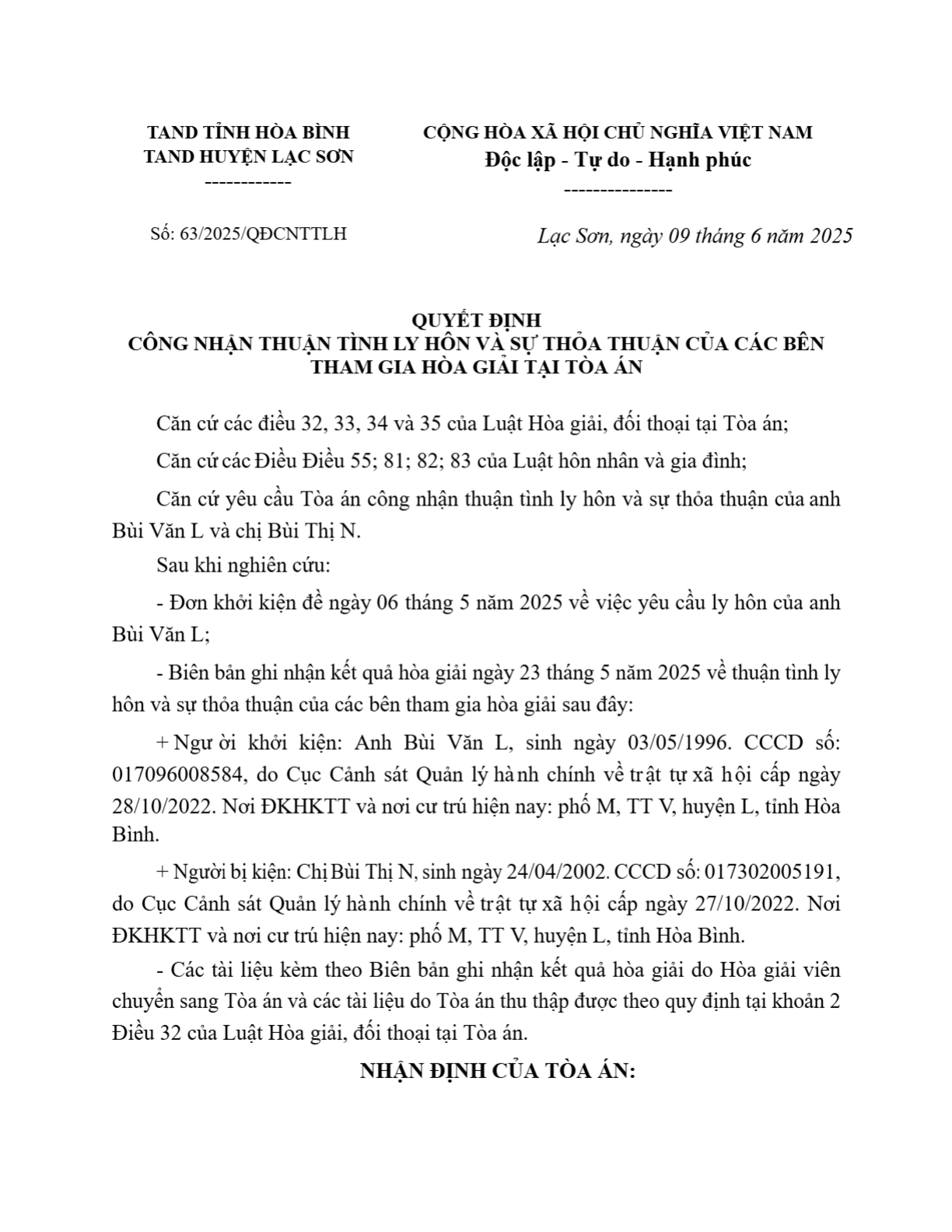 | Tên Quyết định: | Quyết định số 63/2025/QĐCNTTLH ngày 11/06/2025 của TAND huyện Lạc Sơn, tỉnh Hòa Bình về vụ án ly hôn về mâu thuẫn gia đình |