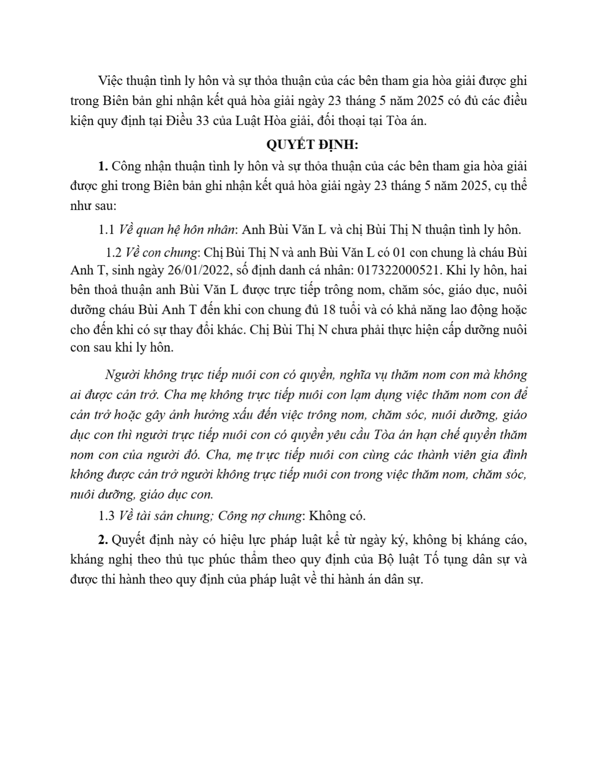 | Thông tin về vụ/việc: | anh Bùi Văn L đề nghị ly hôn với chị Bùi Thị Nh |