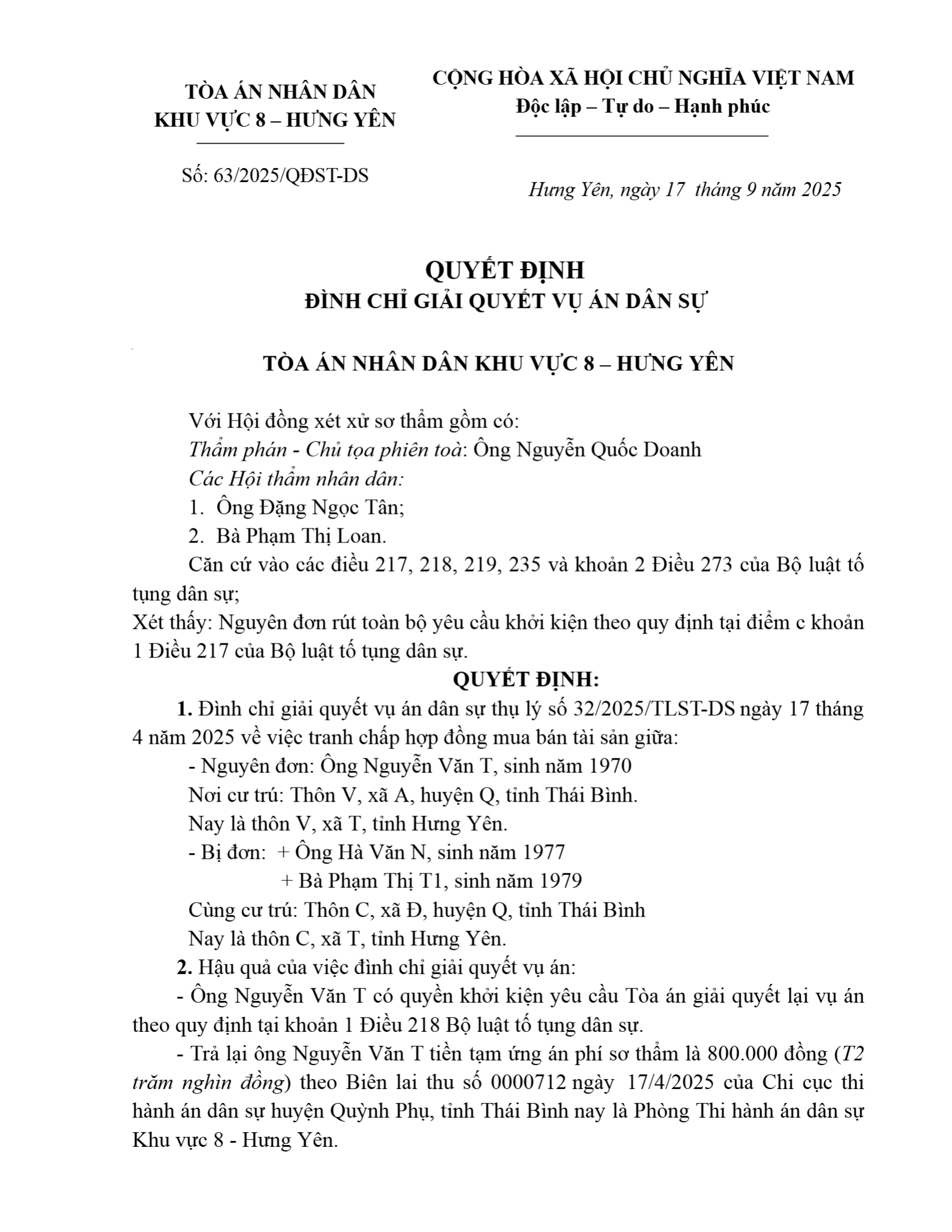 Quyết định số 63/2025/QĐST-DS ngày 17/09/2025 của Tòa án nhân dân khu vực 8 - Hưng Yên, tỉnh Hưng Yên về tranh chấp hợp đồng trao đổi tài sản