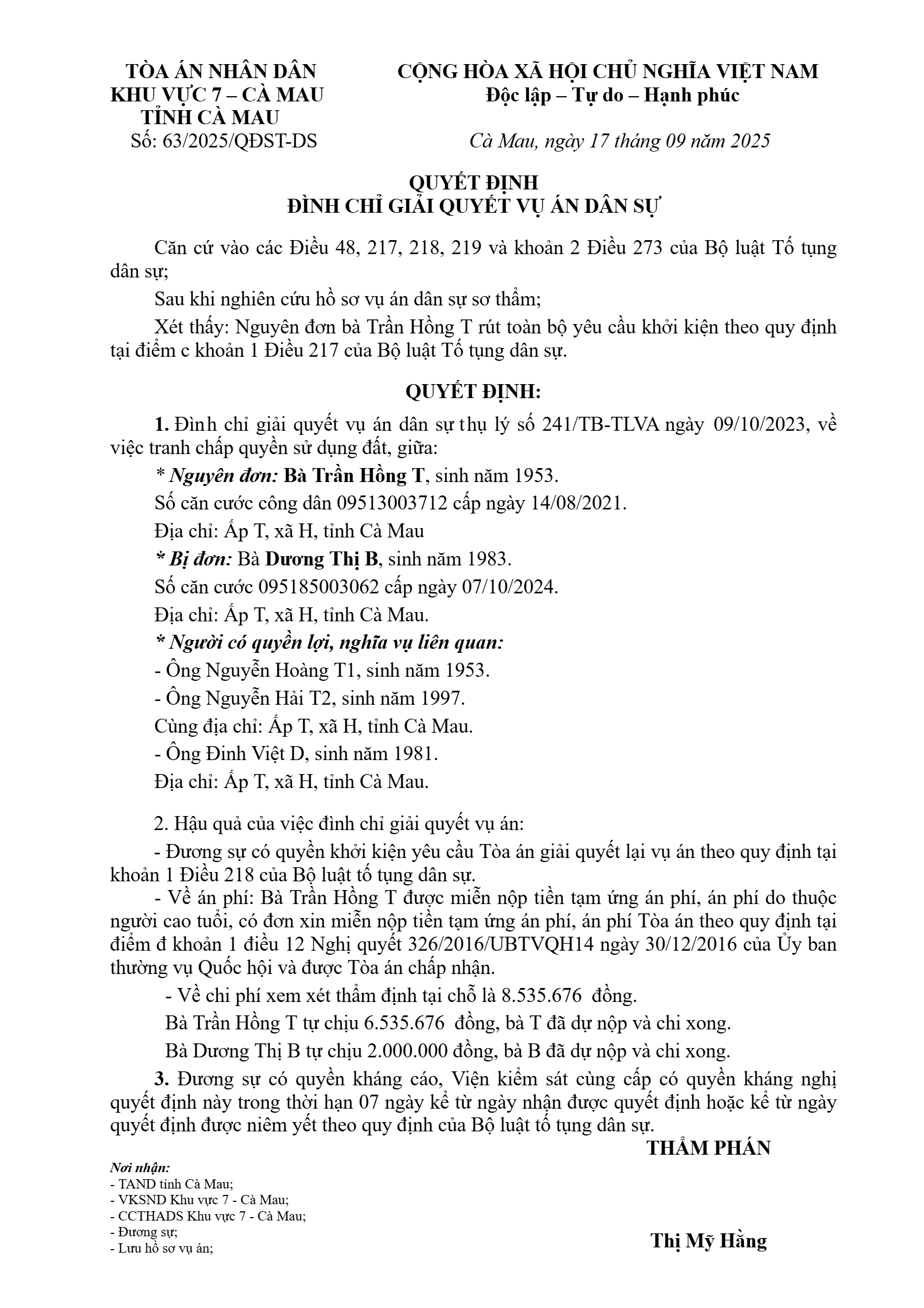 Quyết định số 63/2025/QĐST-DS ngày 17/09/2025 của Tòa án nhân dân khu vực 7 - Cà Mau, tỉnh Cà Mau về tranh chấp đất đai