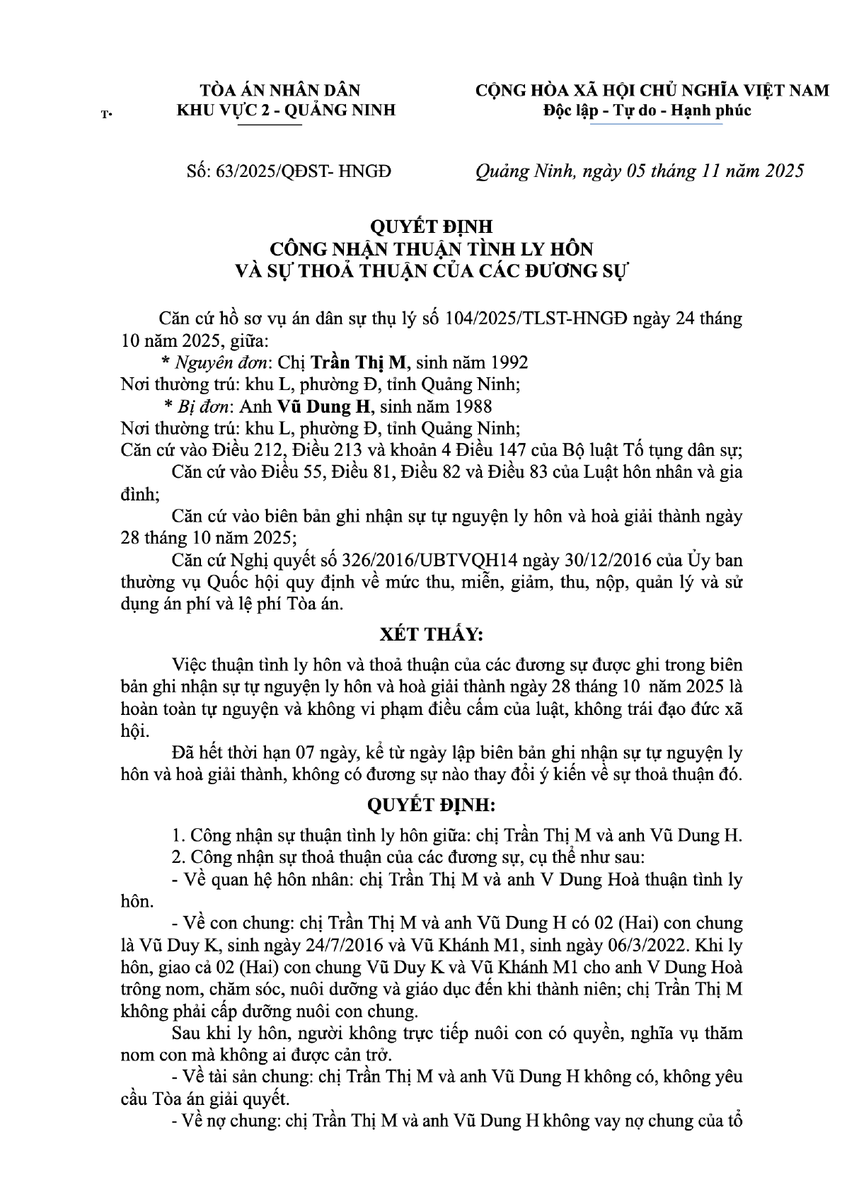 Quyết định số 63/2025/QĐST-HNGĐ ngày 04/11/2025 của Tòa án nhân dân khu vực 2 - Quảng Ninh, tỉnh Quảng Ninh về vụ án ly hôn về mâu thuẫn gia đình