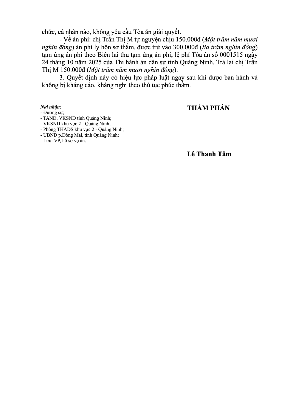 | Thông tin về vụ/việc: | chị Trần Thị M xin ly hôn anh Vũ Dung H |