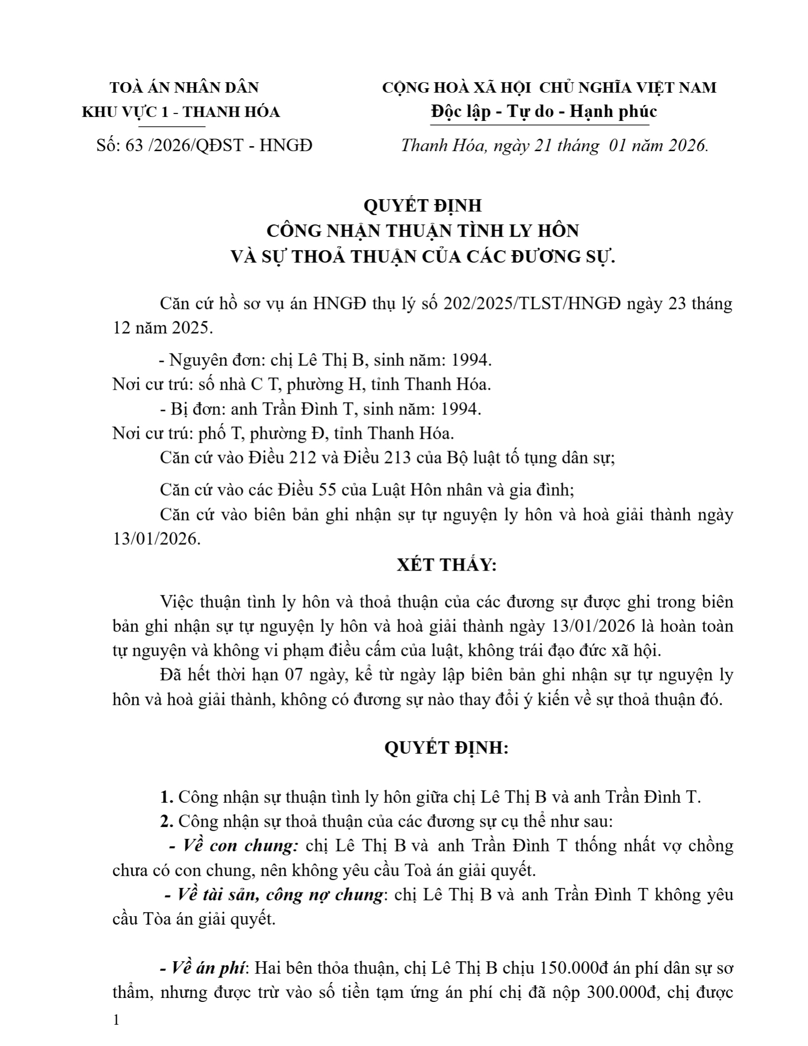 Quyết định số 63/2026/QĐST-HNGĐ ngày 21/01/2026 của Tòa án nhân dân khu vực 1 - Thanh Hóa, tỉnh Thanh Hóa về vụ án ly hôn về mâu thuẫn gia đình