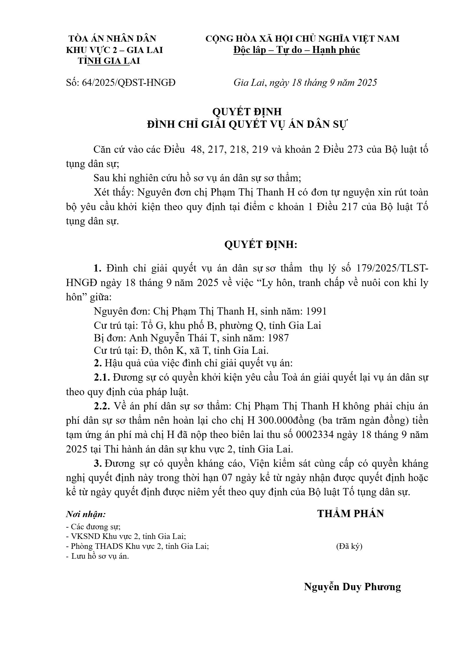 Quyết định số 64/2025/QĐST-HNGĐ ngày 18/09/2025 của Tòa án nhân dân khu vực 2 - Gia Lai, tỉnh Gia Lai về vụ án ly hôn về mâu thuẫn gia đình