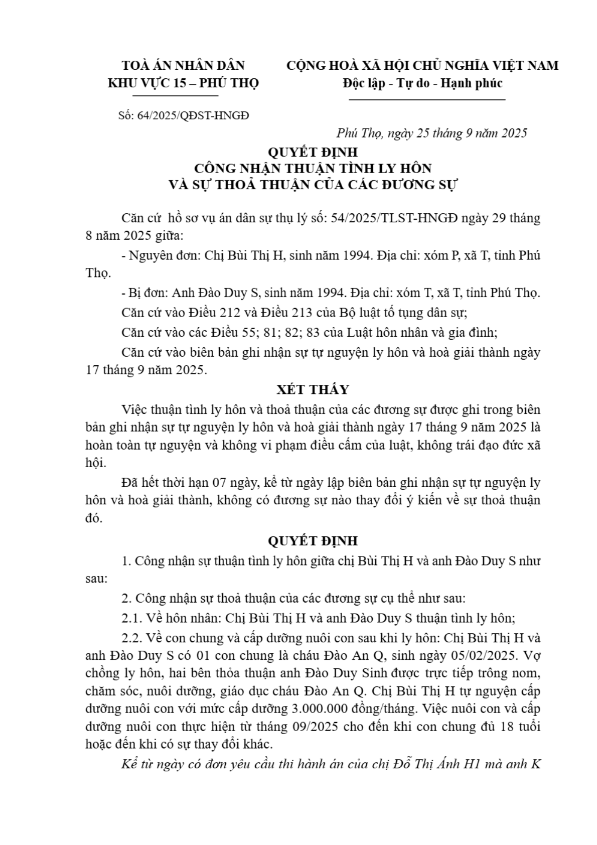 Quyết định số 64/2025/QĐST-HNGĐ ngày 30/09/2025 của Tòa án nhân dân khu vực 15 - Phú Thọ, tỉnh Phú Thọ về vụ án ly hôn về mâu thuẫn gia đình