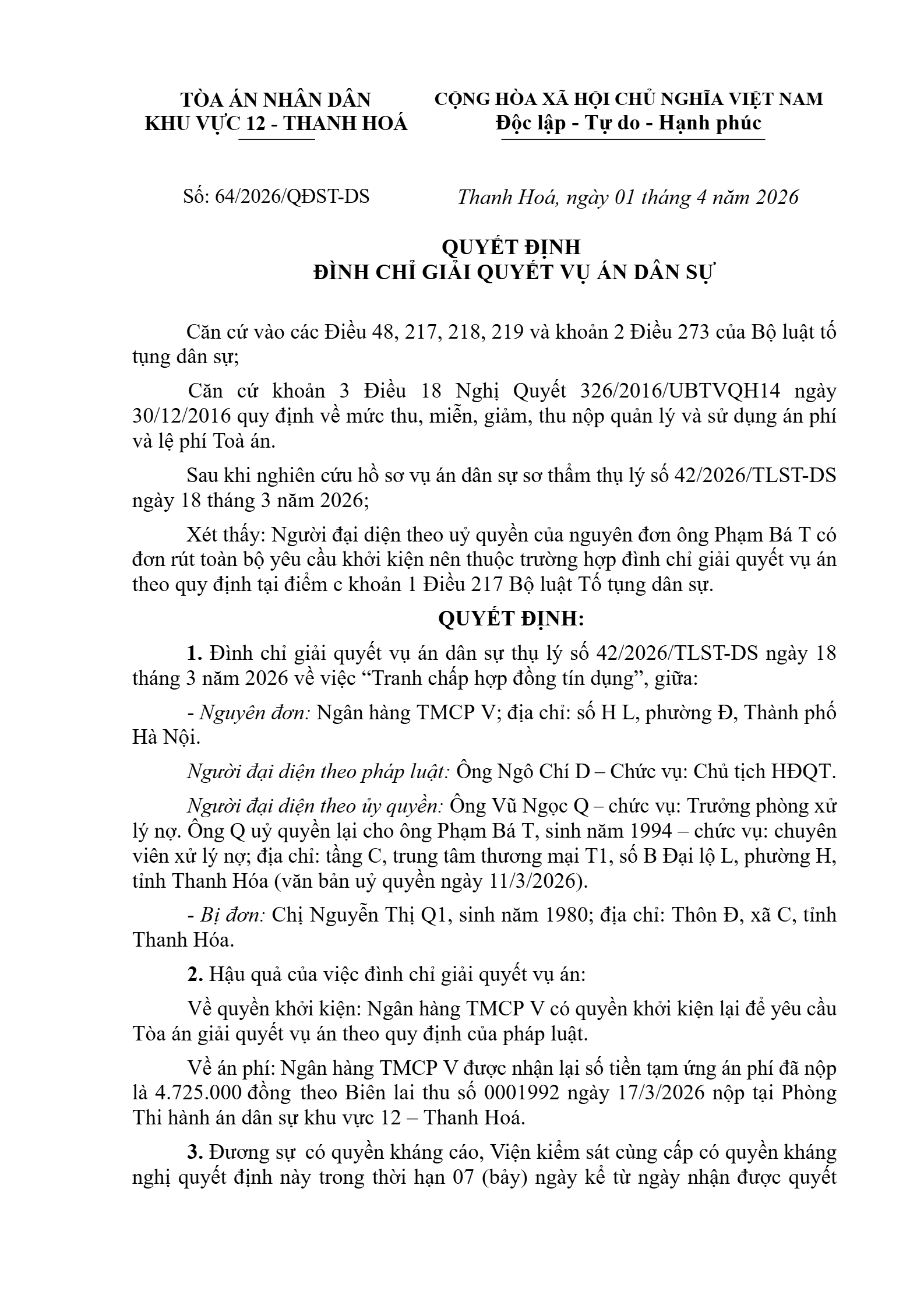 Quyết định số 64/2026/QĐST-DS ngày 01/04/2026 của Tòa án nhân dân khu vực 12 - Thanh Hóa, tỉnh Thanh Hóa về tranh chấp hợp đồng tín dụng