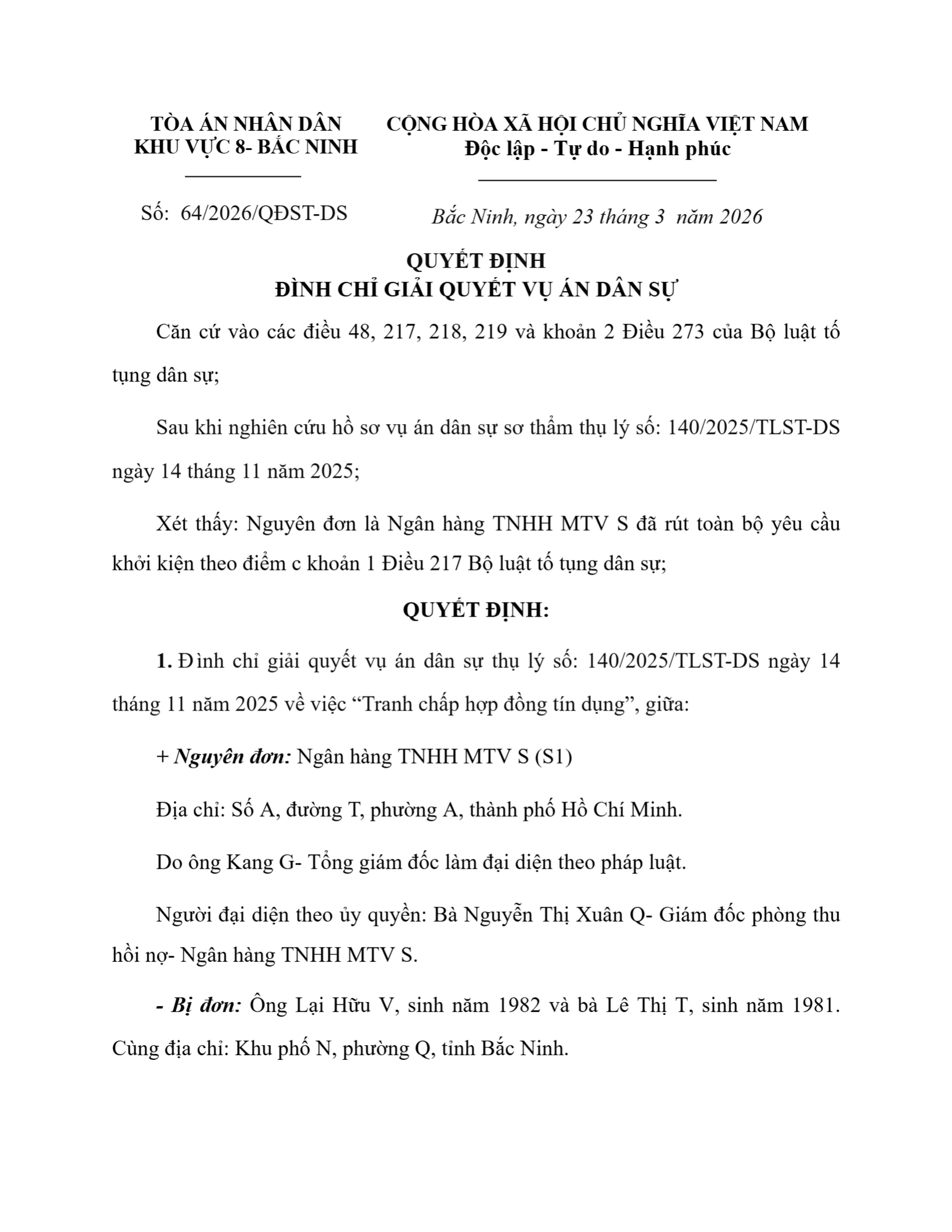 Quyết định số 64/2026/QĐST-DS ngày 23/03/2026 của Tòa án nhân dân khu vực 8 - Bắc Ninh, tỉnh Bắc Ninh về tranh chấp hợp đồng tín dụng