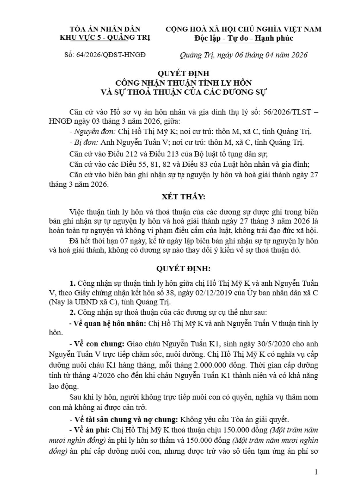 Quyết định số 64/2026/QĐST-HNGĐ ngày 06/04/2026 của Tòa án nhân dân khu vực 5 - Quảng Trị, tỉnh Quảng Trị về vụ án ly hôn về mâu thuẫn gia đình