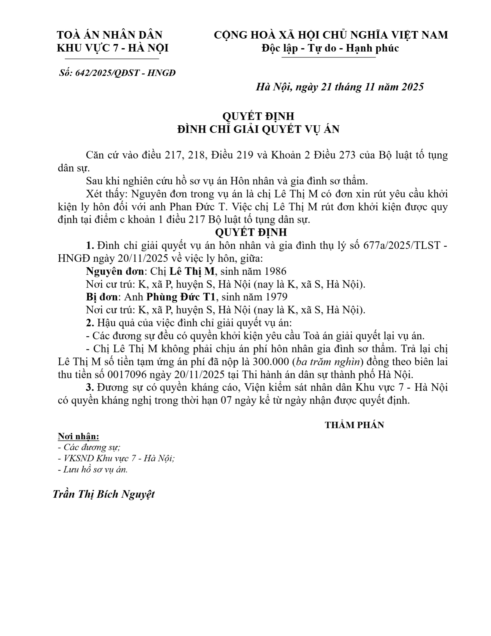 Quyết định số 642/2025/QĐST-HNGĐ ngày 21/11/2025 của Tòa án nhân dân khu vực 7 - Hà Nội, TP. Hà Nội về vụ án ly hôn về mâu thuẫn gia đình