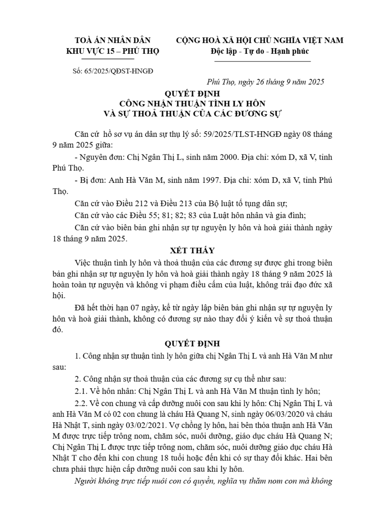 Quyết định số 65/2025/QĐST-HNGĐ ngày 30/09/2025 của Tòa án nhân dân khu vực 15 - Phú Thọ, tỉnh Phú Thọ về vụ án ly hôn về mâu thuẫn gia đình