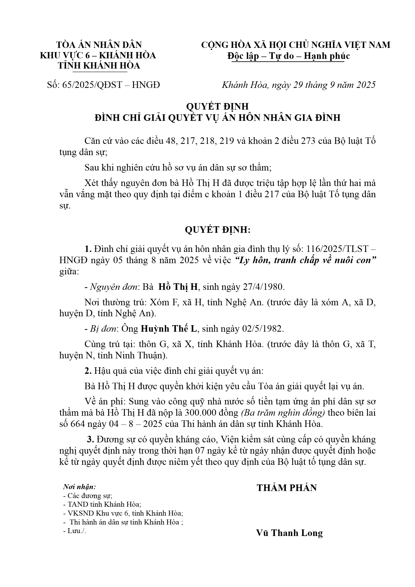 Quyết định số 65/2025/QĐST-HNGĐ ngày 29/09/2025 của Tòa án nhân dân khu vực 6 - Khánh Hòa, tỉnh Khánh Hòa về vụ án ly hôn về mâu thuẫn gia đình