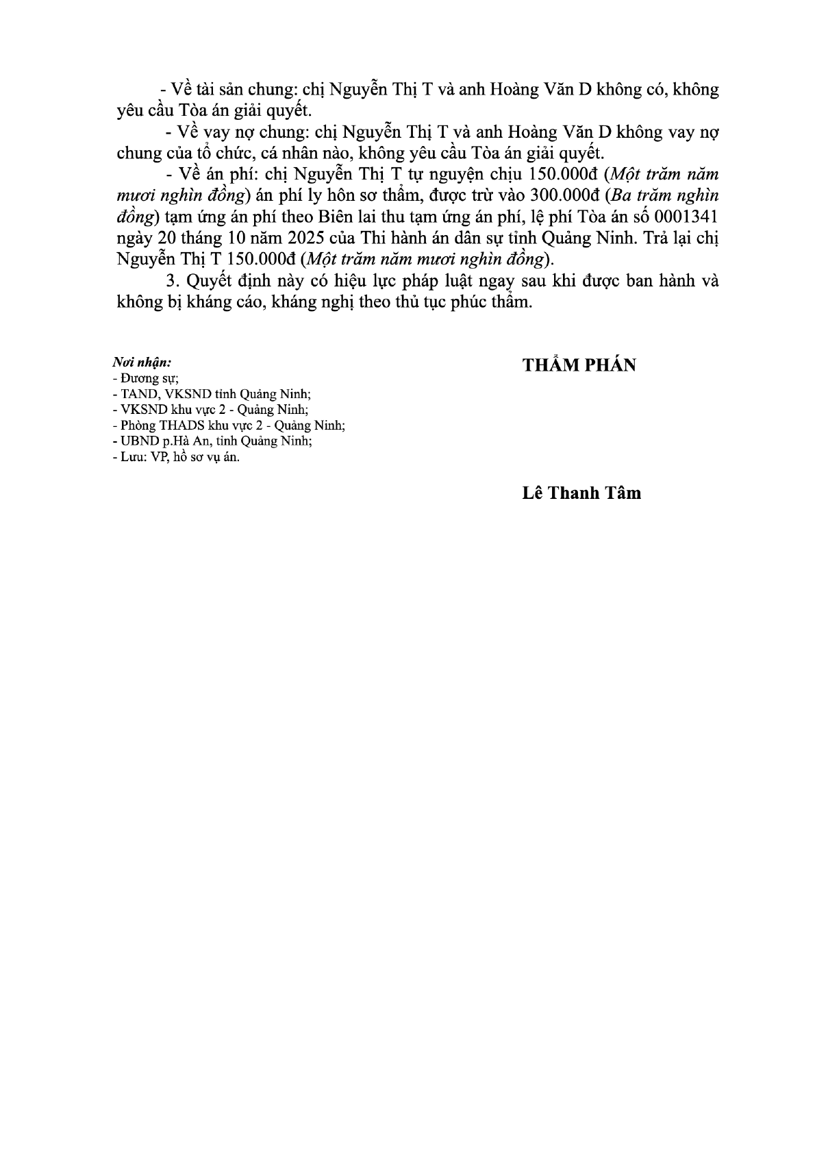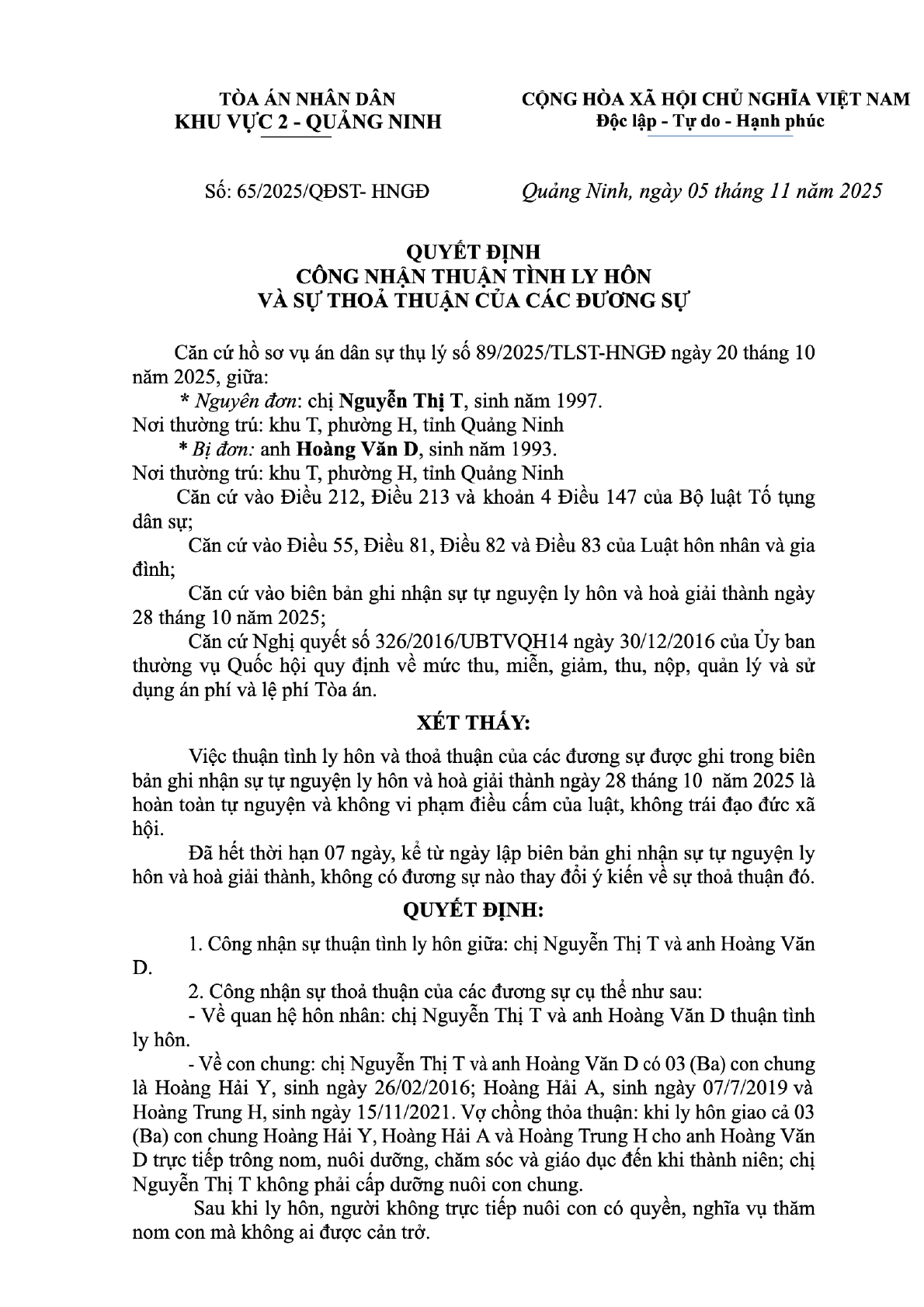 Quyết định số 65/2025/QĐSt-HNGĐ ngày 05/11/2025 của Tòa án nhân dân khu vực 2 - Quảng Ninh, tỉnh Quảng Ninh về vụ án ly hôn về mâu thuẫn gia đình