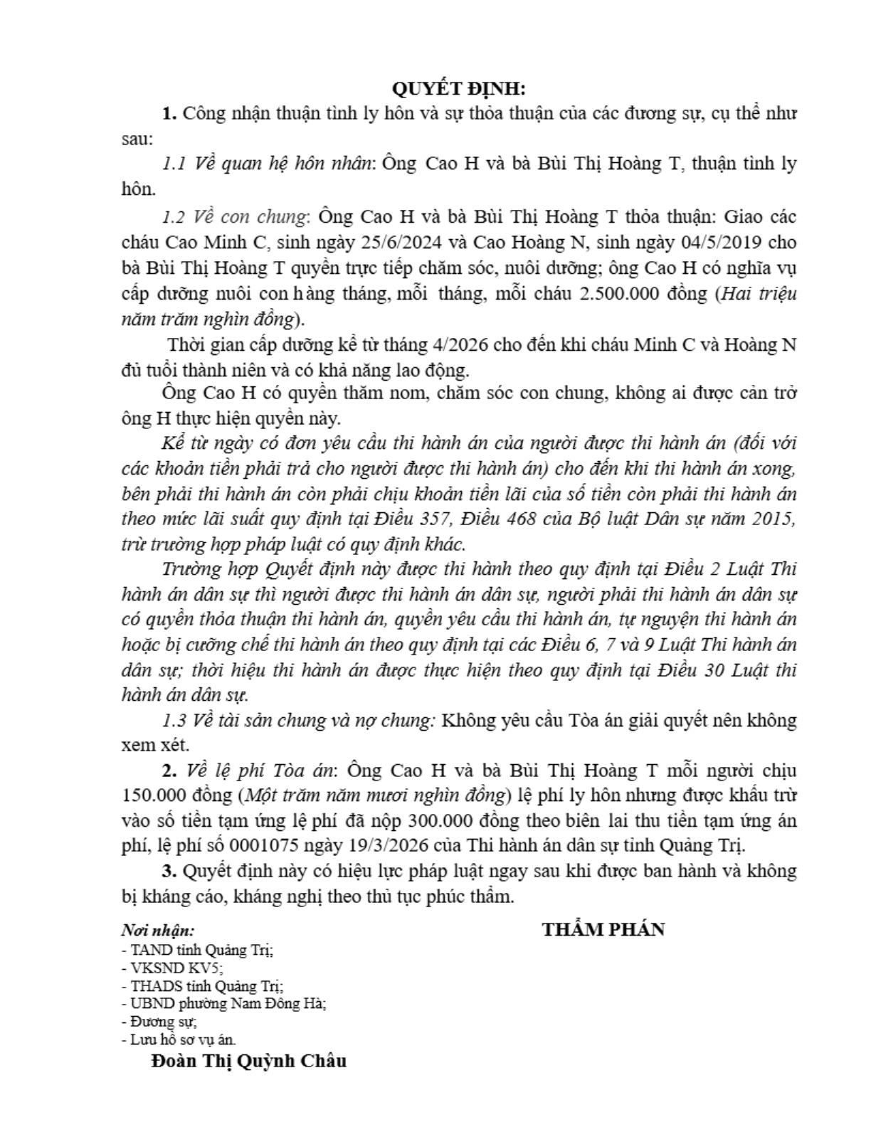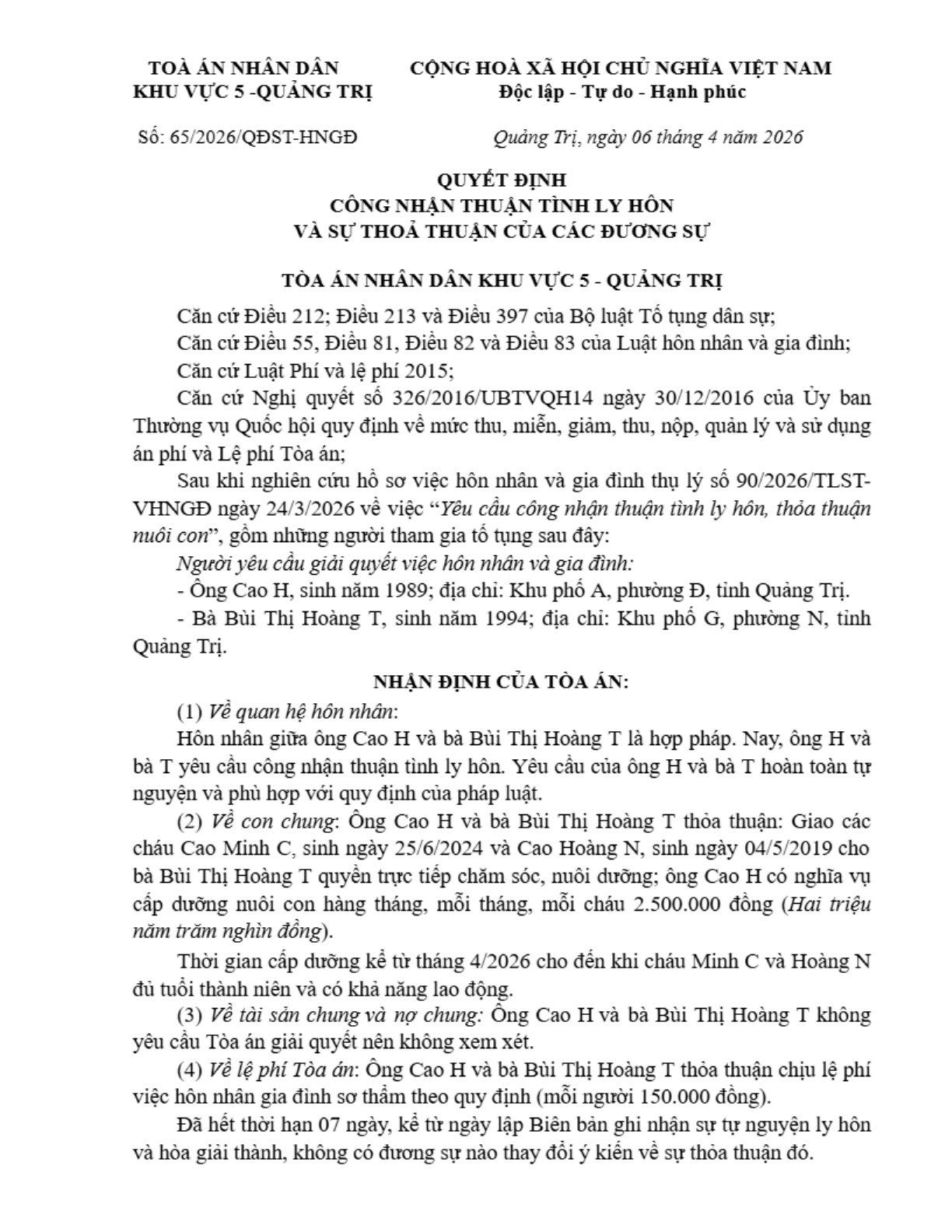 Quyết định số 65/2026/QĐST-HNGĐ ngày 06/04/2026 của Tòa án nhân dân khu vực 5 - Quảng Trị, tỉnh Quảng Trị về yêu cầu công nhận thuận tình ly hôn