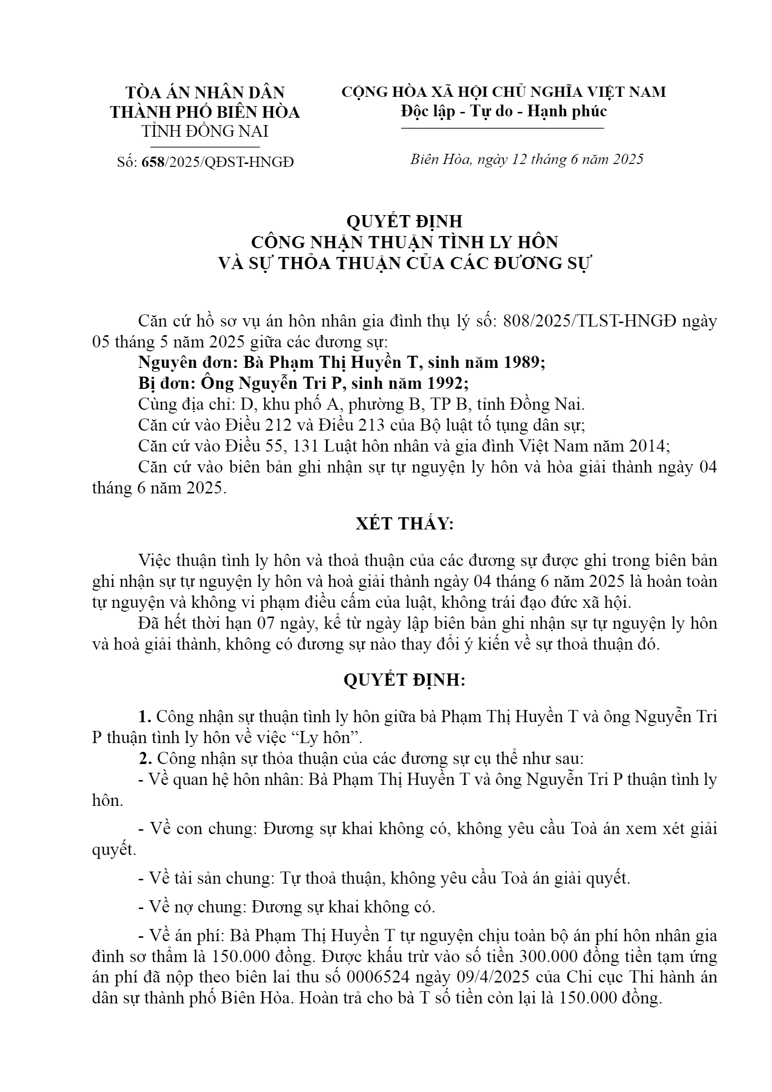 Quyết định số 658/2025/QĐST-HNGĐ ngày 12/06/2025 của TAND TP. Biên Hòa, tỉnh Đồng Nai về vụ án ly hôn về mâu thuẫn gia đình
