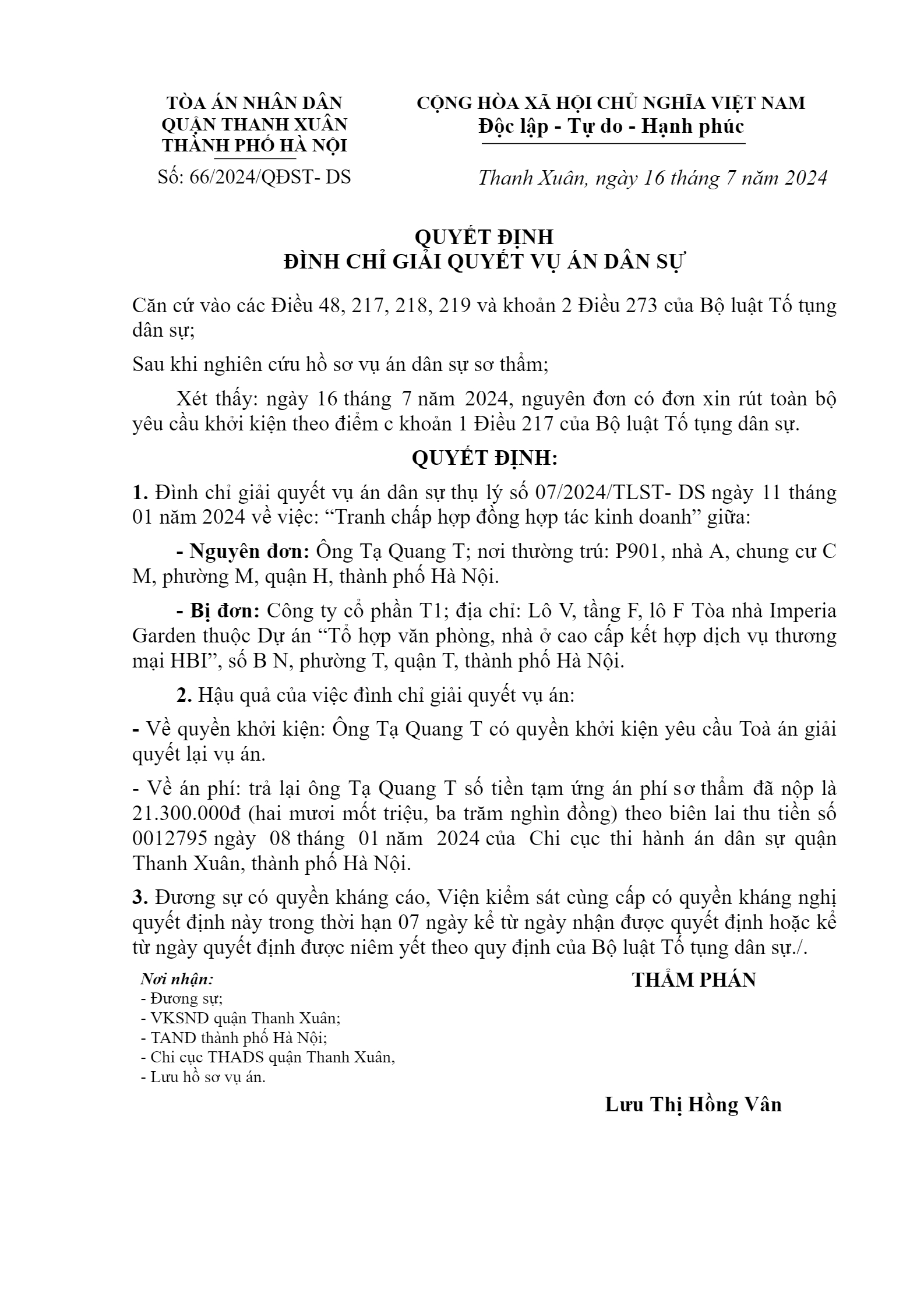 Quyết định số 66/2024/QĐST-DS ngày 16/07/2024 của TAND Q. Thanh Xuân, TP. Hà Nội về tranh chấp hợp đồng hợp tác