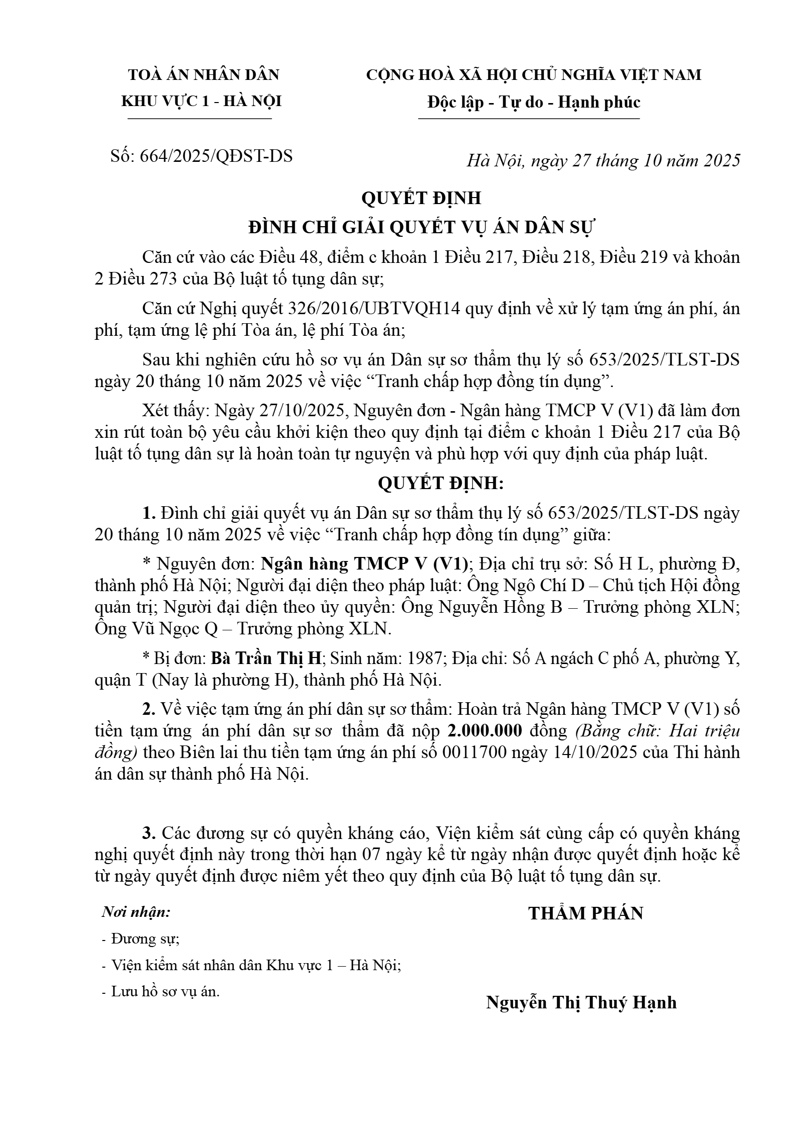 | Thông tin về vụ/việc: | Đình chỉ giải quyết vụ án tranh chấp hợp đồng tín dụng giữa Ngân hàng TMCP V (V1) và Bà Trần Thị H |
