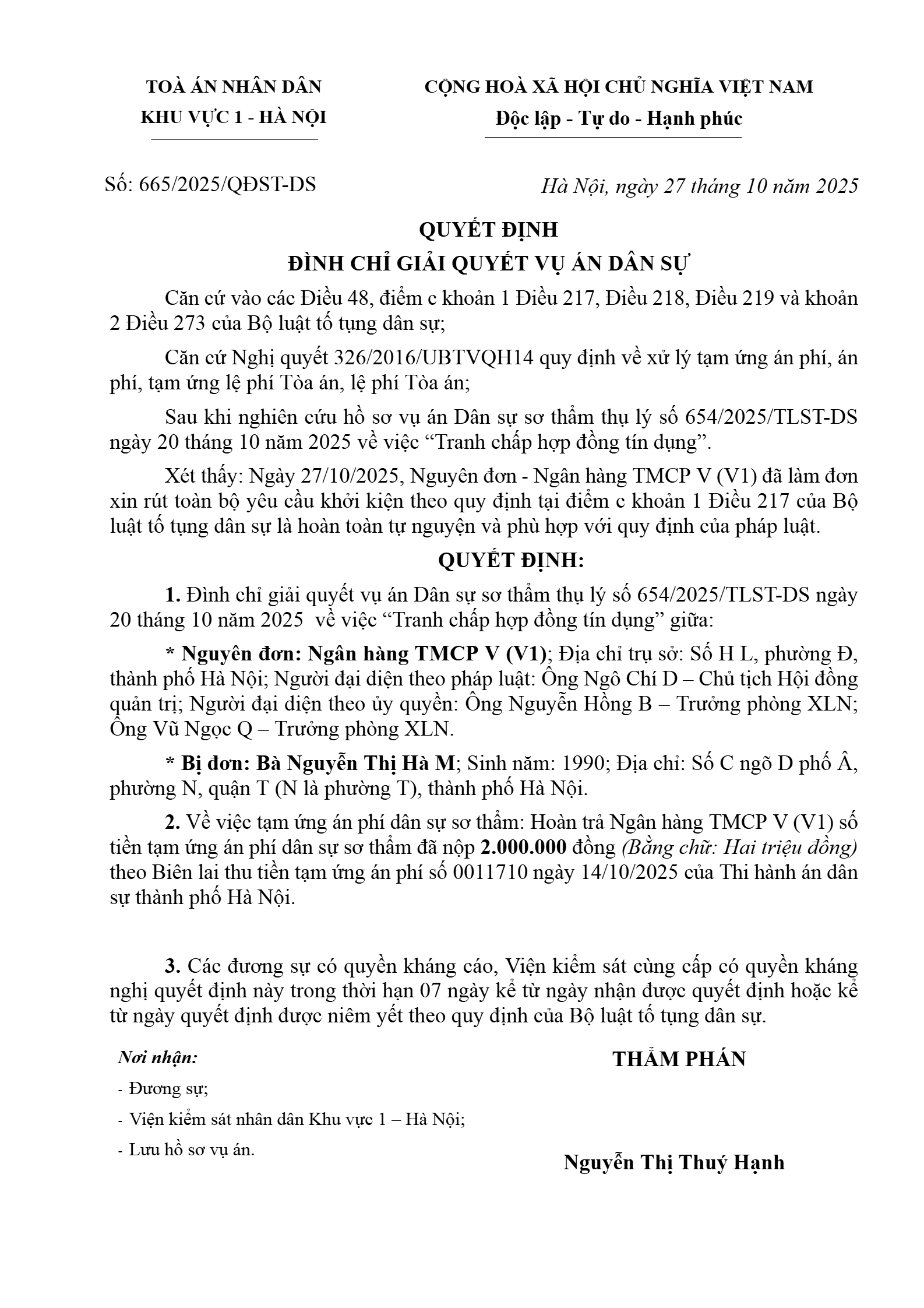 | Thông tin về vụ/việc: | Đình chỉ giải quyết vụ án tranh chấp hợp đồng tín dụng giữa Ngân hàng TMCP V (V1) và Bà Nguyễn Thị Hà M |