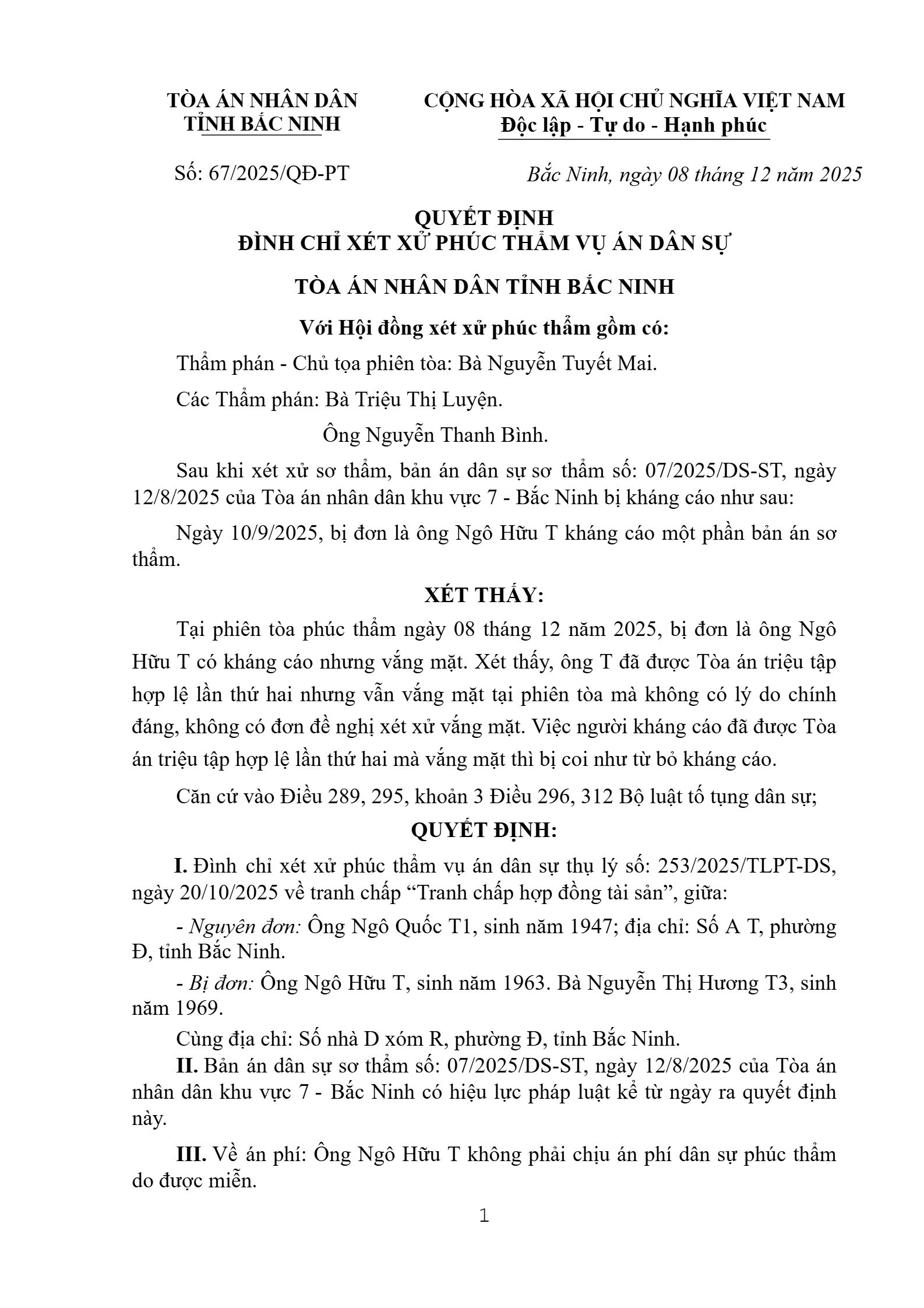 | Tên Quyết định: | Quyết định số 67/2025/QĐ-PT ngày 08/12/2025 của TAND tỉnh Bắc Ninh về tranh chấp hợp đồng vay tài sản |