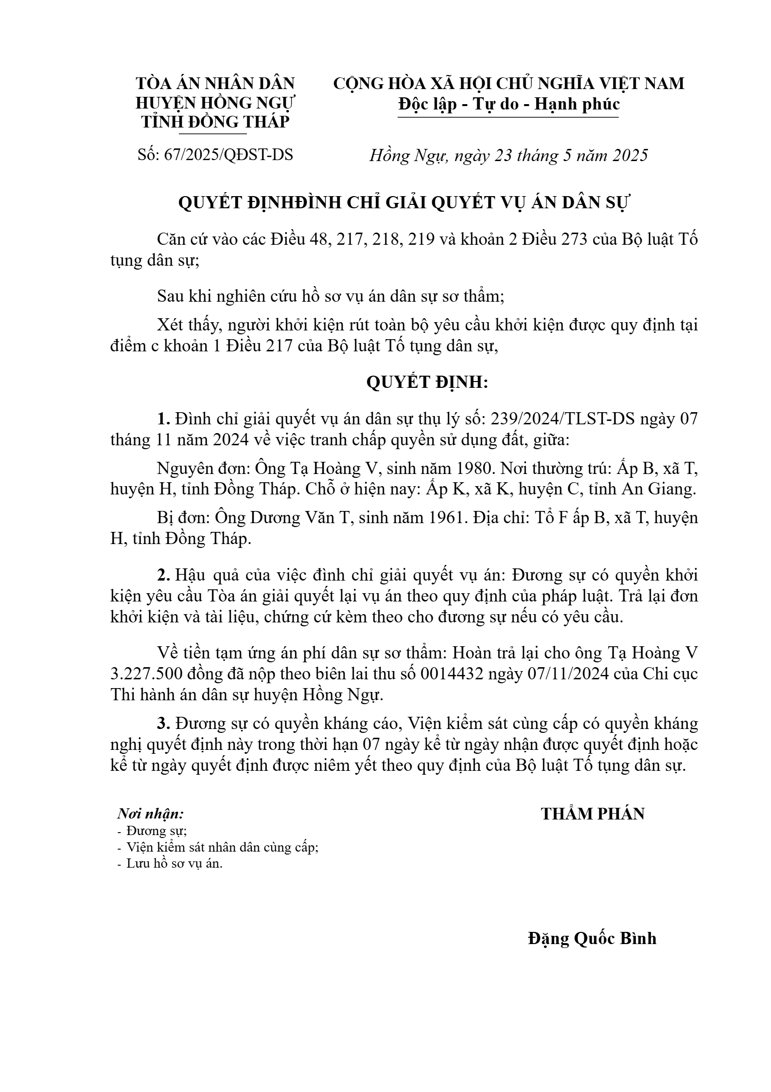 | Tên Quyết định: | Quyết định số 67/2025/QĐST-DS ngày 23/05/2025 của TAND huyện Hồng Ngự, tỉnh Đồng Tháp về tranh chấp đất đai |