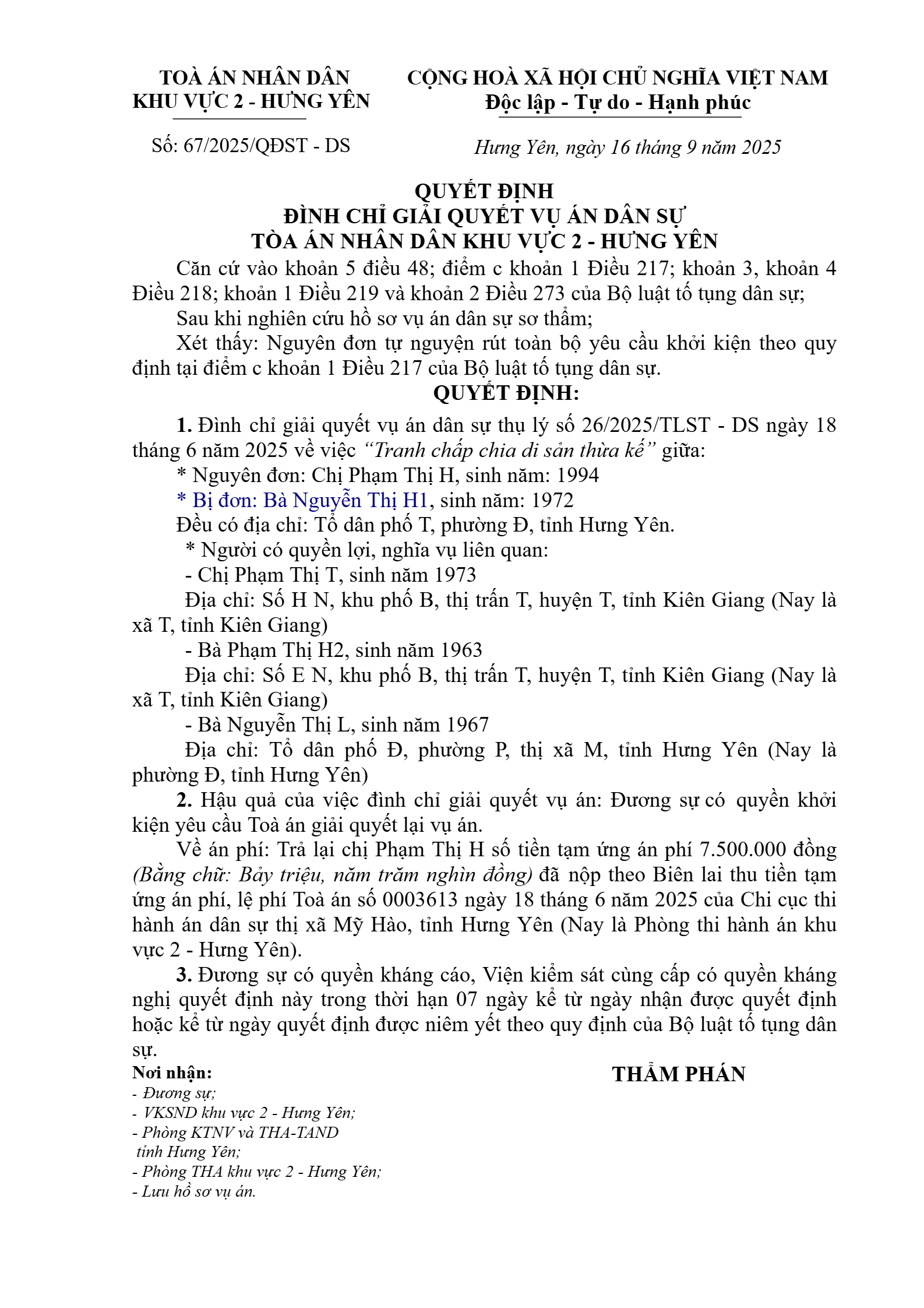 Quyết định số 67/2025/QĐST-DS ngày 16/09/2025 của Tòa án nhân dân khu vực 2 - Hưng Yên, tỉnh Hưng Yên về tranh chấp về thừa kế tài sản