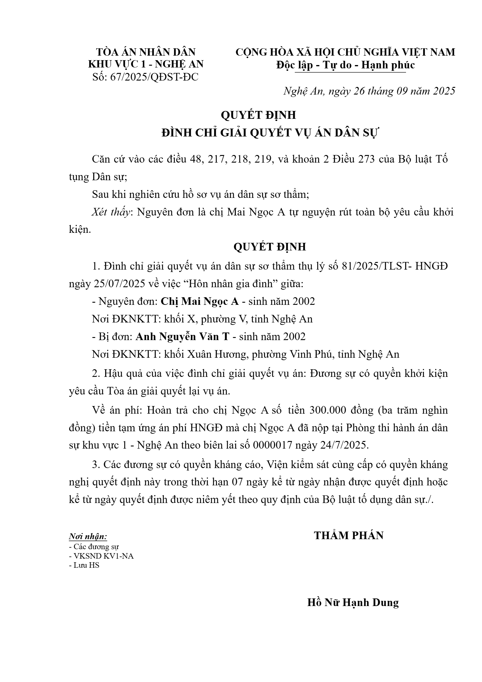 Quyết định số 67/2025/QĐST-HNGĐ ngày 26/09/2025 của Tòa án nhân dân khu vực 1 - Nghệ An, tỉnh Nghệ An về vụ án ly hôn về mâu thuẫn gia đình