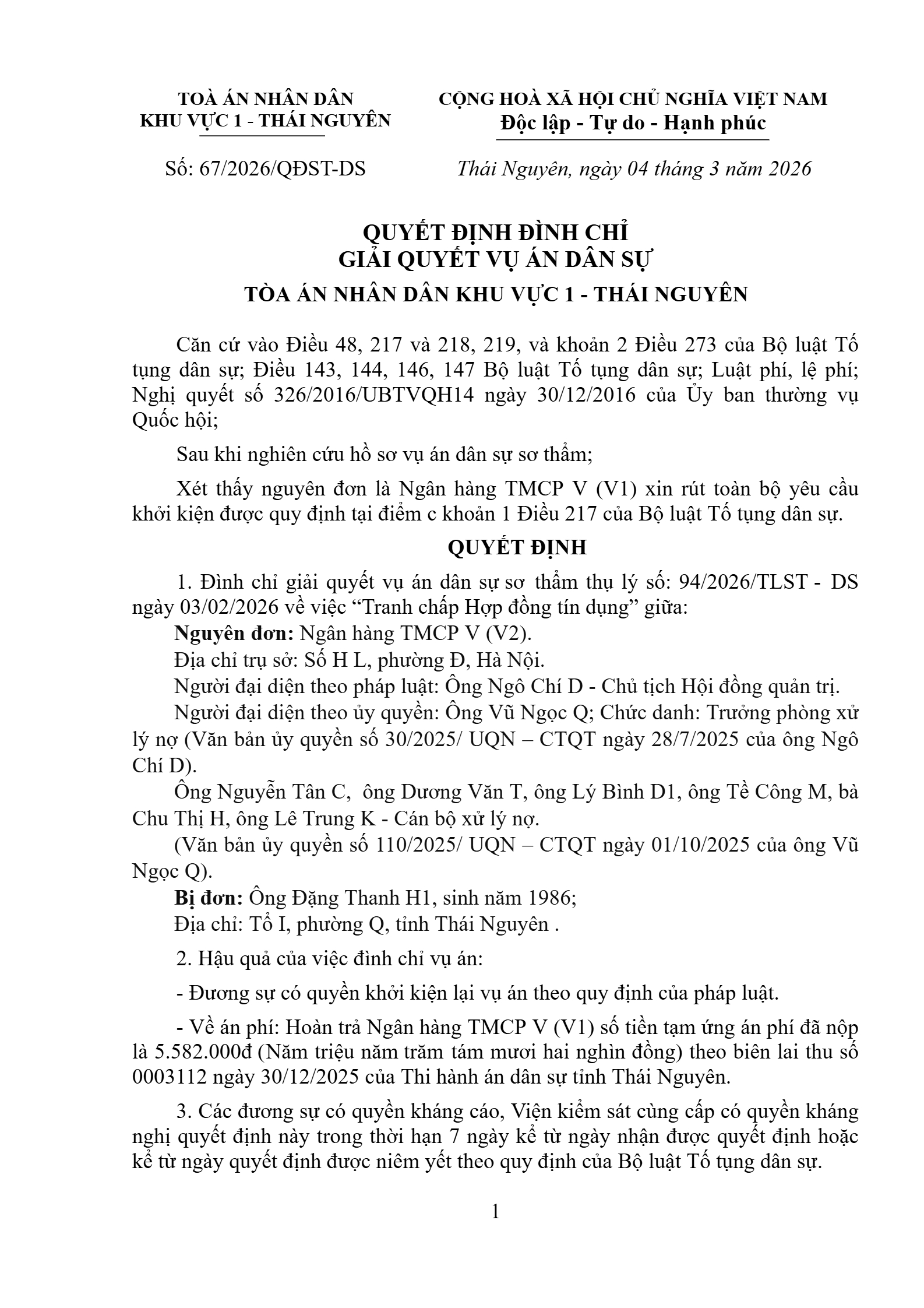 Quyết định số 67/2026/QĐST-DS ngày 04/03/2026 của Tòa án nhân dân khu vực 1 - Thái Nguyên, tỉnh Thái Nguyên về tranh chấp hợp đồng tín dụng