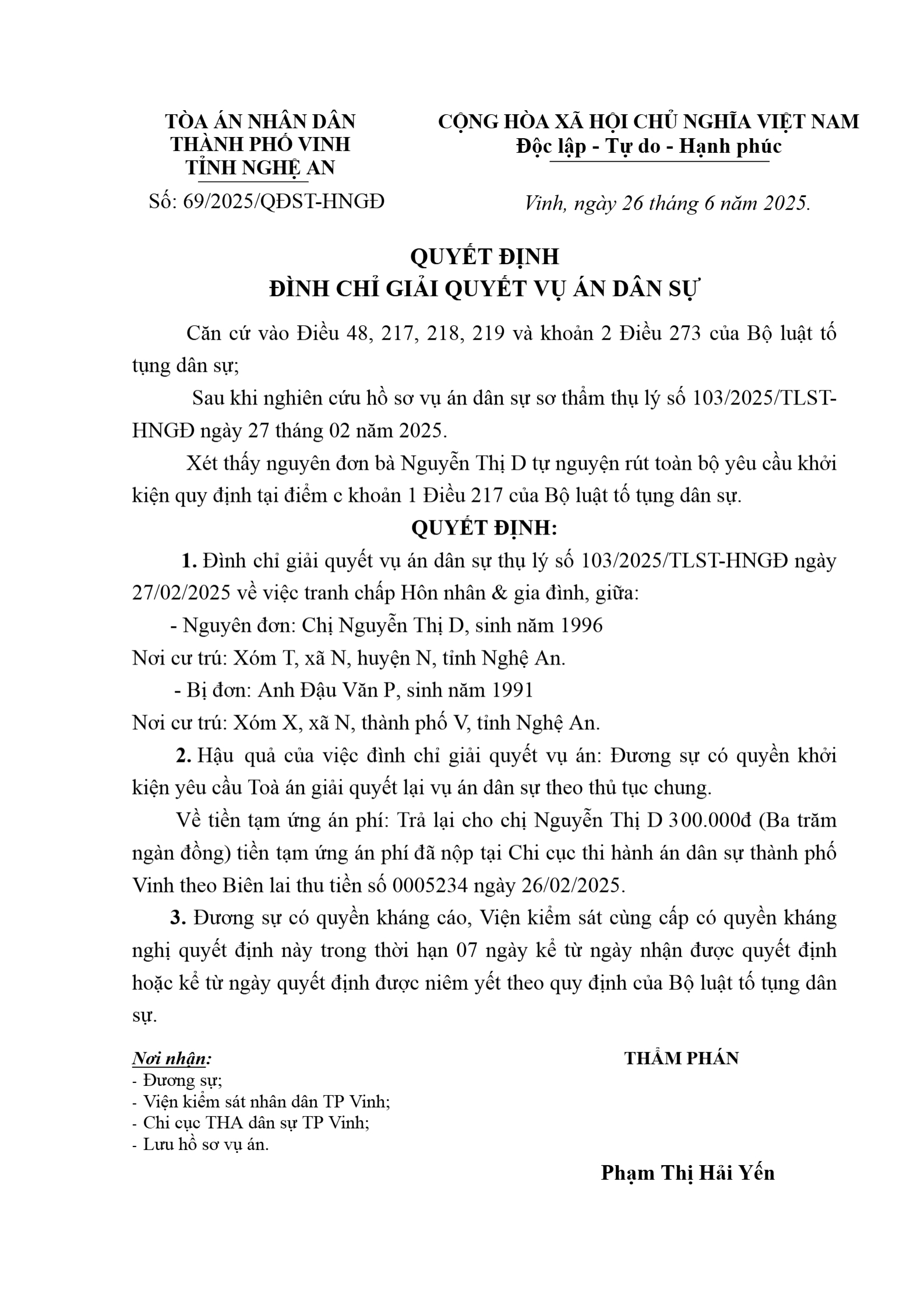 Quyết định số 69/2025/QĐST-HNGĐ ngày 26/06/2025 của TAND TP. Vinh, tỉnh Nghệ An về vụ án ly hôn về mâu thuẫn gia đình