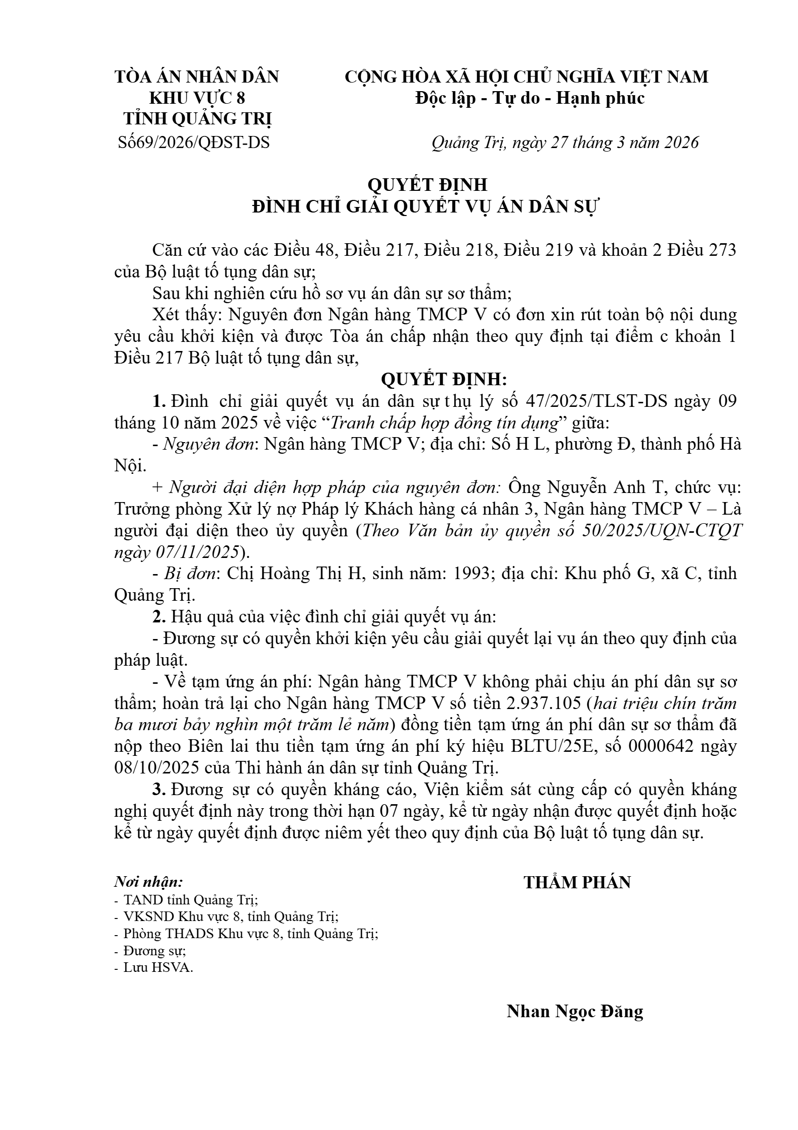 Quyết định số 69/2026/QĐST-DS ngày 27/03/2026 của Tòa án nhân dân khu vực 8 - Quảng Trị, tỉnh Quảng Trị về tranh chấp hợp đồng tín dụng