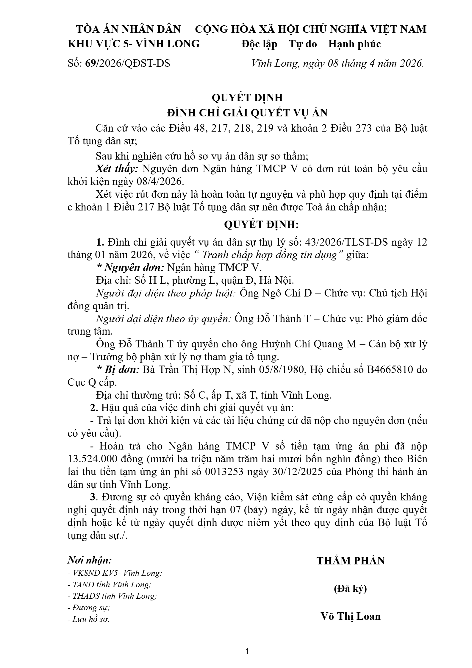 Quyết định số 69/2026/QĐST-DS ngày 08/04/2026 của Tòa án nhân dân khu vực 5 - Vĩnh Long, tỉnh Vĩnh Long về tranh chấp hợp đồng tín dụng
