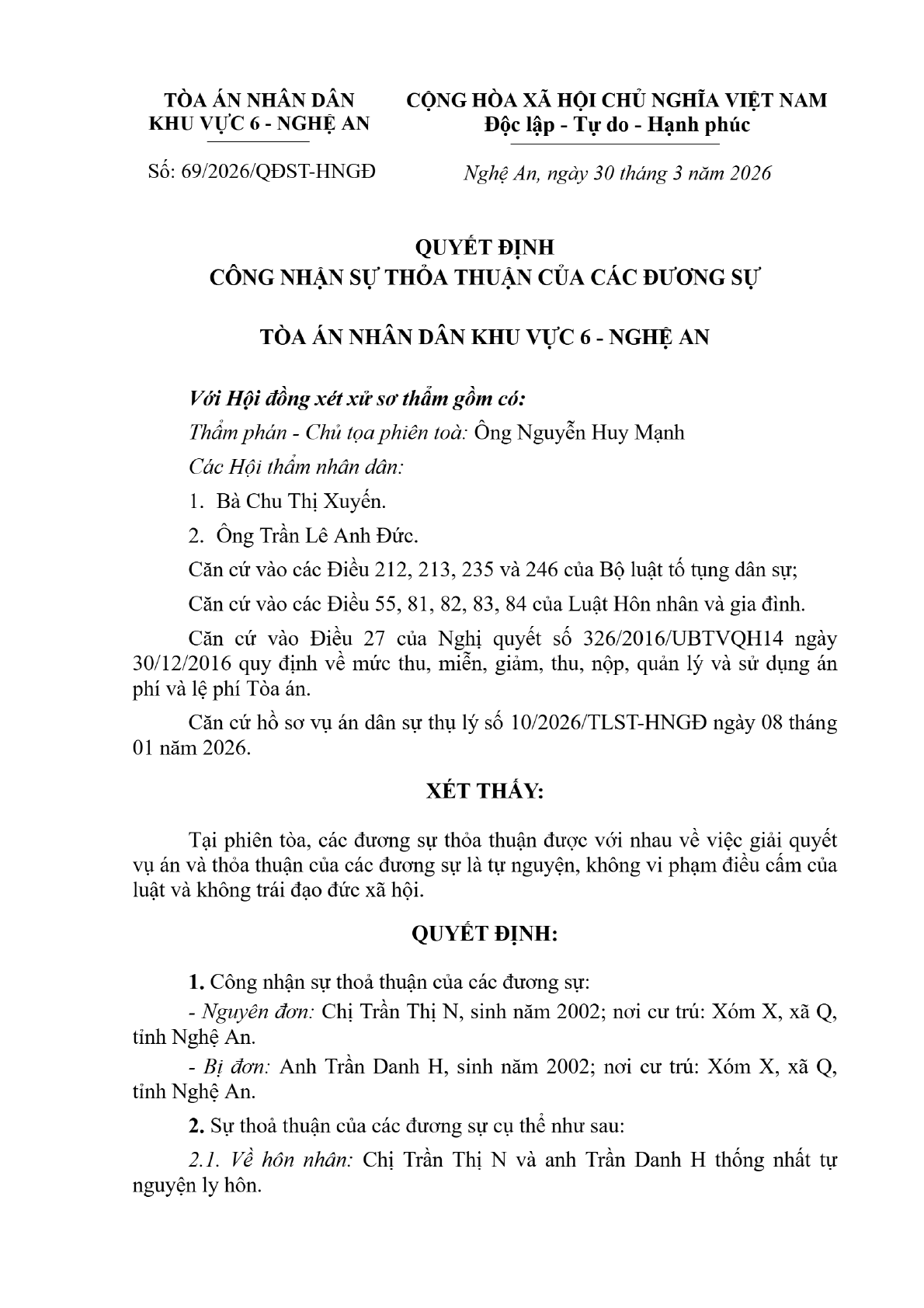 Quyết định số 69/2026/QĐST-HNGĐ ngày 30/03/2026 của Tòa án nhân dân khu vực 6 - Nghệ An, tỉnh Nghệ An về vụ án ly hôn về mâu thuẫn gia đình
