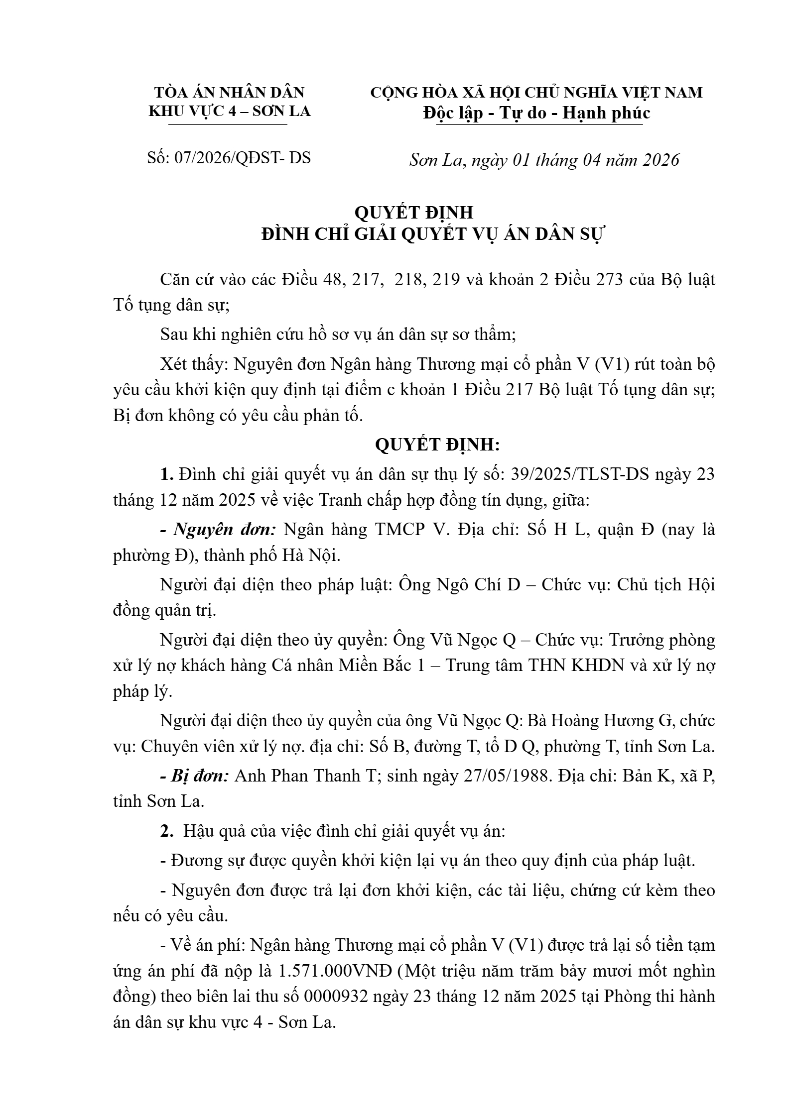 Quyết định số 7/2026/QĐST-DS ngày 01/04/2026 của Tòa án nhân dân khu vực 4 - Sơn La, tỉnh Sơn La về tranh chấp hợp đồng tín dụng