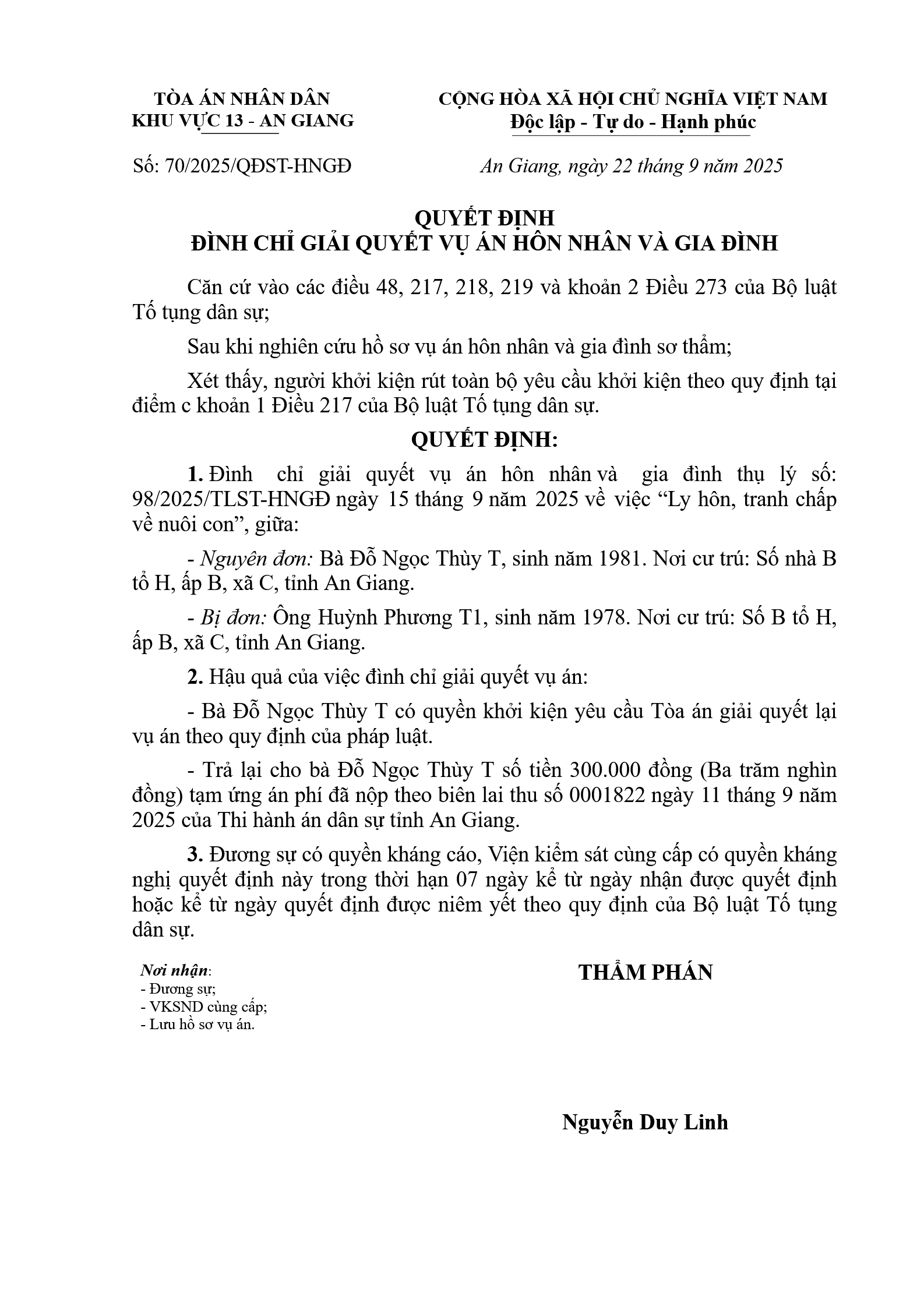 Quyết định số 70/2025/QĐST-HNGĐ ngày 22/09/2025 của Tòa án nhân dân khu vực 13 - An Giang, tỉnh An Giang về vụ án ly hôn về mâu thuẫn gia đình