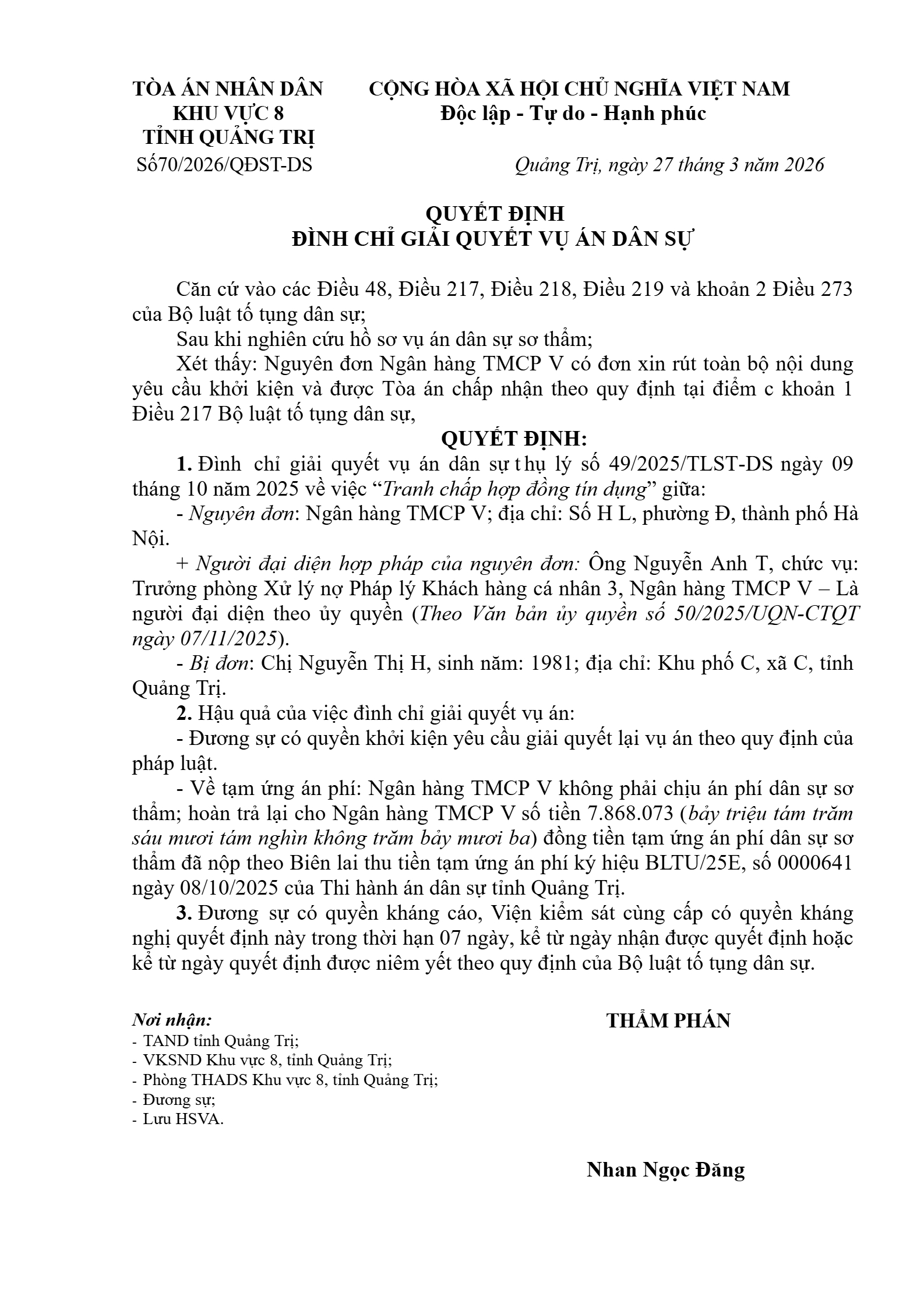 Quyết định số 70/2026/QĐST-DS ngày 27/03/2026 của Tòa án nhân dân khu vực 8 - Quảng Trị, tỉnh Quảng Trị về tranh chấp hợp đồng tín dụng