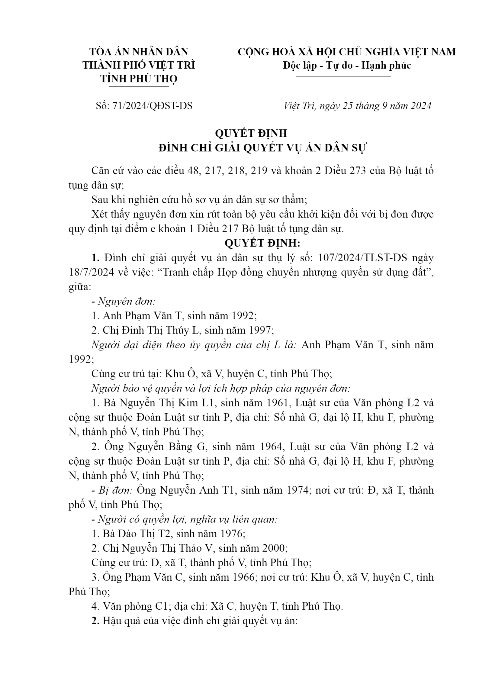 | Tên Quyết định: | Quyết định số 71/2024/QĐST-DS ngày 25/09/2024 của TAND TP. Việt Trì, tỉnh Phú Thọ về tranh chấp hợp đồng chuyển nhượng quyền sử dụng đất |