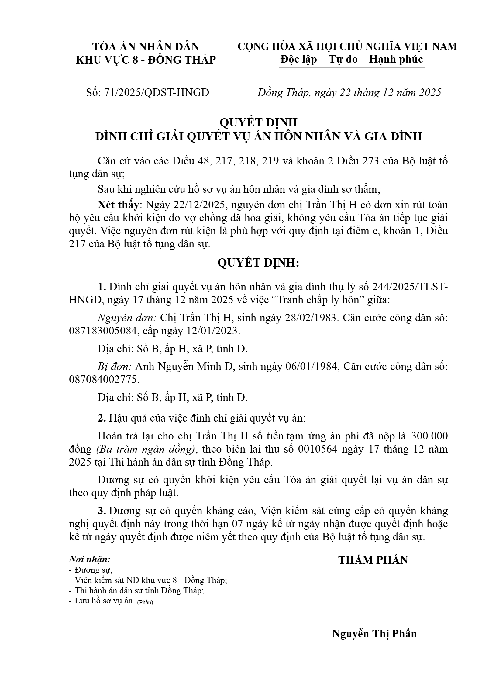 Quyết định số 71/2025/QĐST- ngày 22/12/2025 của Tòa án nhân dân khu vực 8 - Đồng Tháp, tỉnh Đồng Tháp về vụ án ly hôn do mâu thuẫn về kinh tế