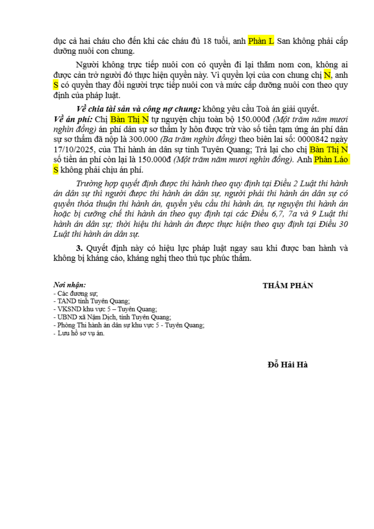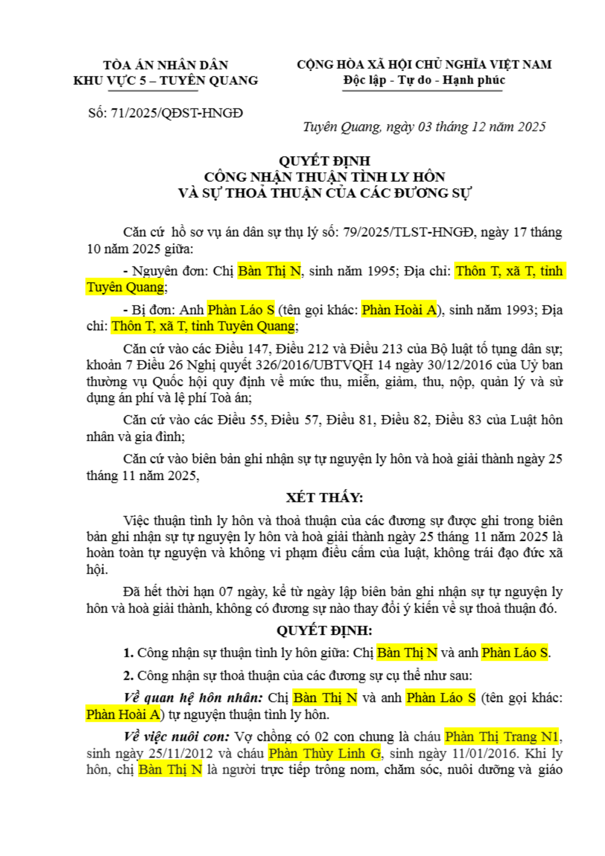 Quyết định số 71/2025/QĐST-HNGĐ ngày 03/12/2025 của Tòa án nhân dân khu vực 5 - Tuyên Quang, tỉnh Tuyên Quang về vụ án ly hôn về mâu thuẫn gia đình