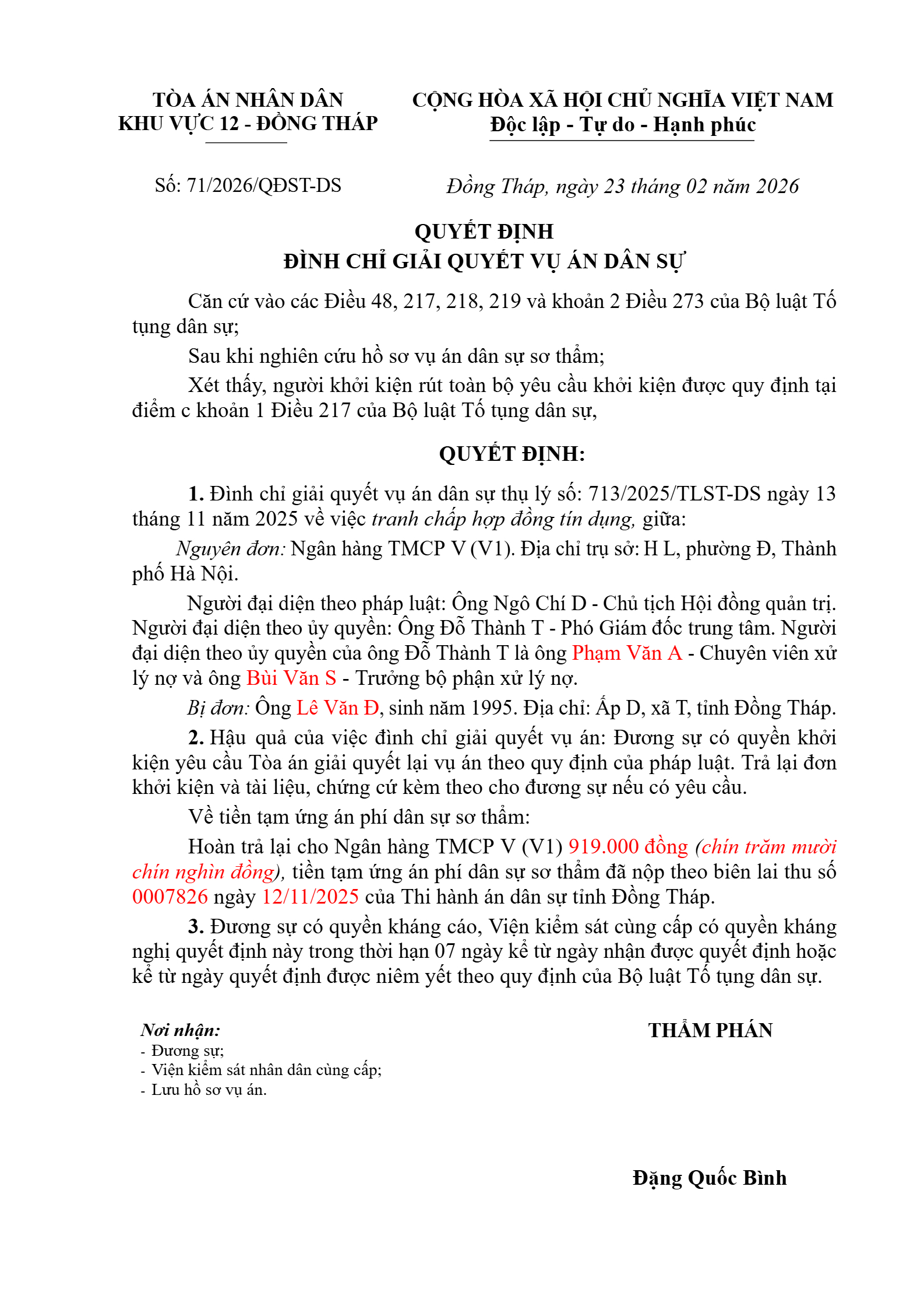Quyết định số 71/2026/QĐST-DS ngày 23/02/2026 của Tòa án nhân dân khu vực 12 - Đồng Tháp, tỉnh Đồng Tháp về tranh chấp hợp đồng tín dụng
