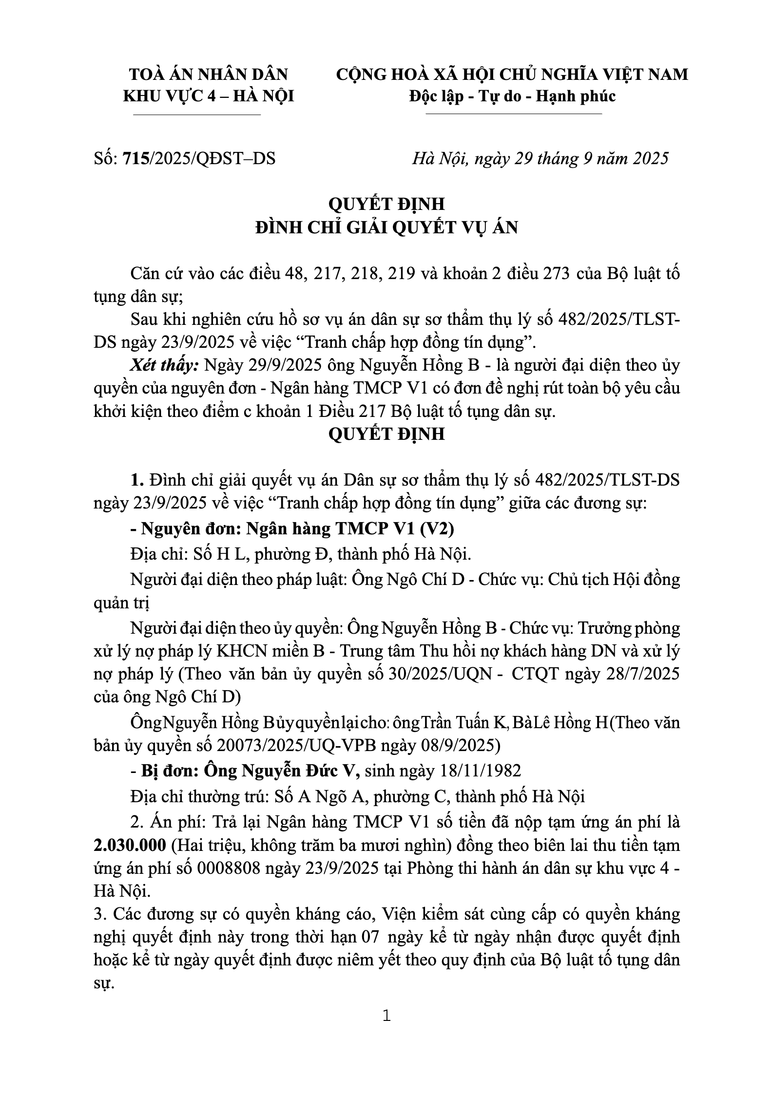 Quyết định số 715/2025/QĐST-DS ngày 30/09/2025 của Tòa án nhân dân khu vực 4 - Hà Nội, TP. Hà Nội về tranh chấp hợp đồng tín dụng