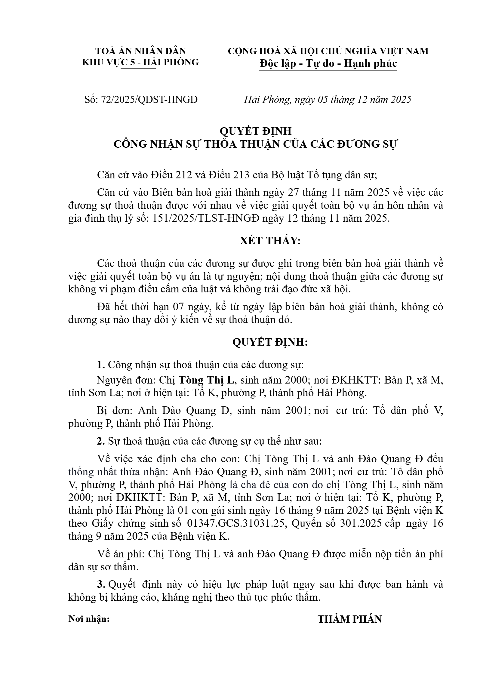 Quyết định số 72/2025/QĐST-HNGĐ ngày 05/12/2025 của Tòa án nhân dân khu vực 5 - Hải Phòng, TP. Hải Phòng về tranh chấp về xác định cha, mẹ cho con hoặc con cho cha mẹ