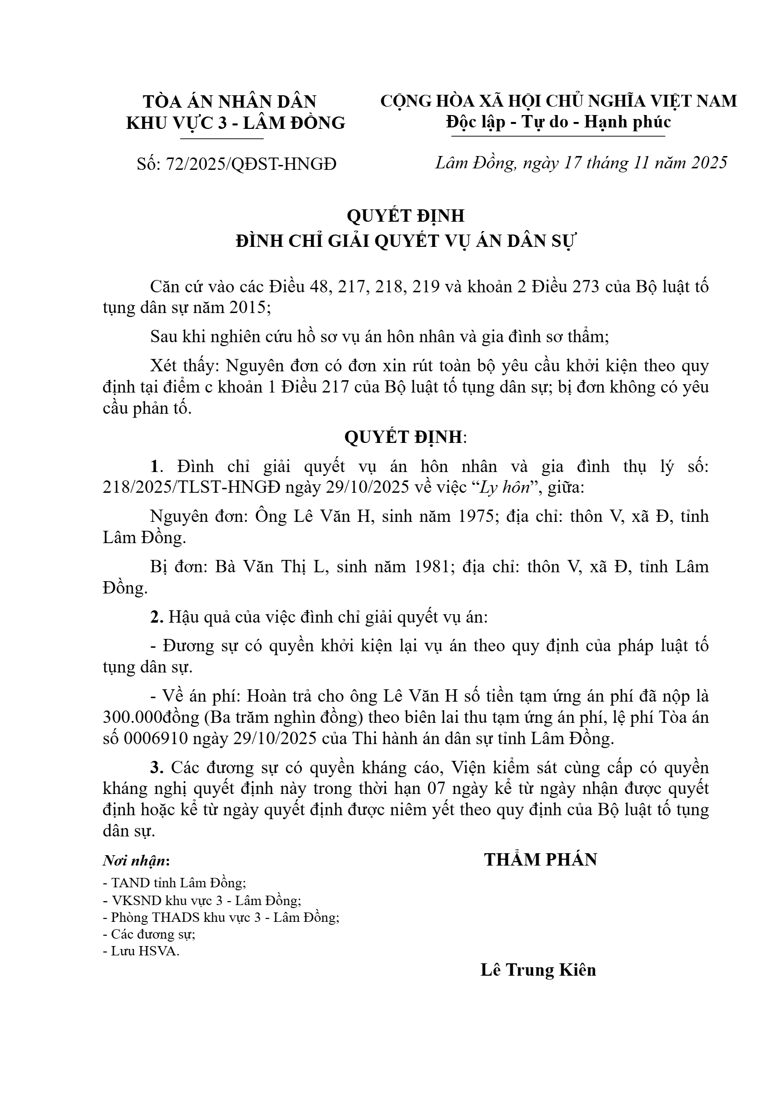 Quyết định số 72/2025/QĐST-HNGĐ ngày 17/11/2025 của Tòa án nhân dân khu vực 3 - Lâm Đồng, tỉnh Lâm Đồng về vụ án ly hôn về mâu thuẫn gia đình