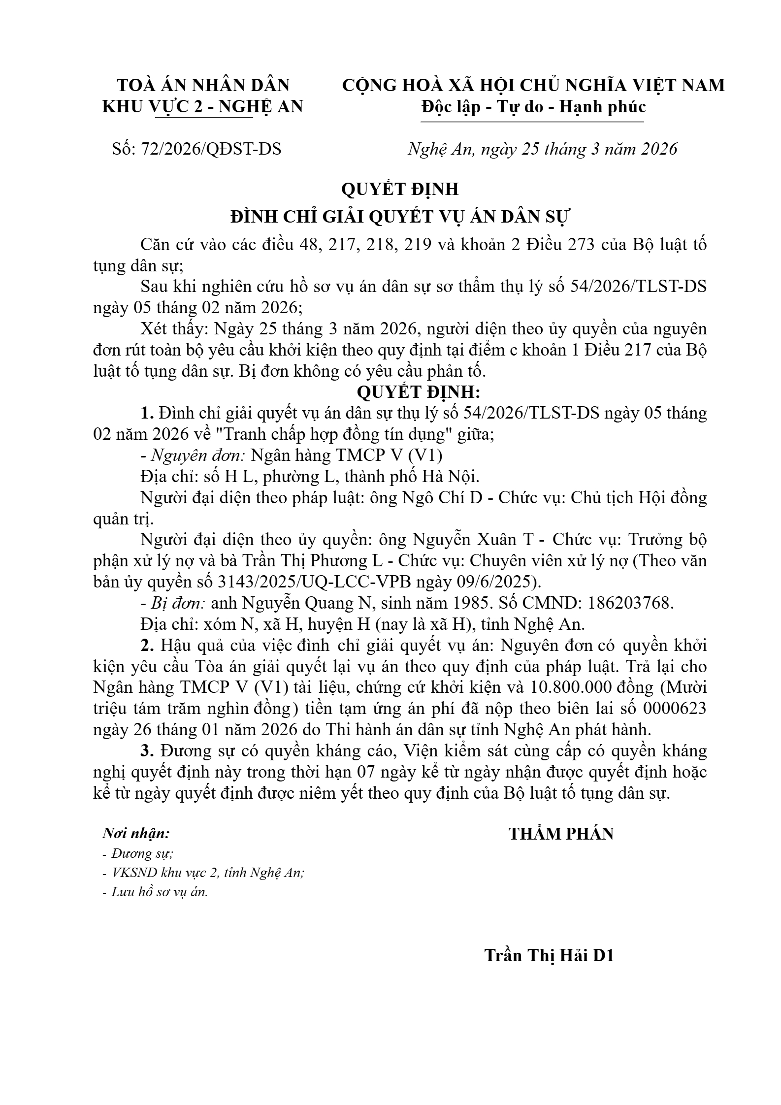 Quyết định số 72/2026/QĐST-DS ngày 25/03/2026 của Tòa án nhân dân khu vực 2 - Nghệ An, tỉnh Nghệ An về tranh chấp hợp đồng tín dụng