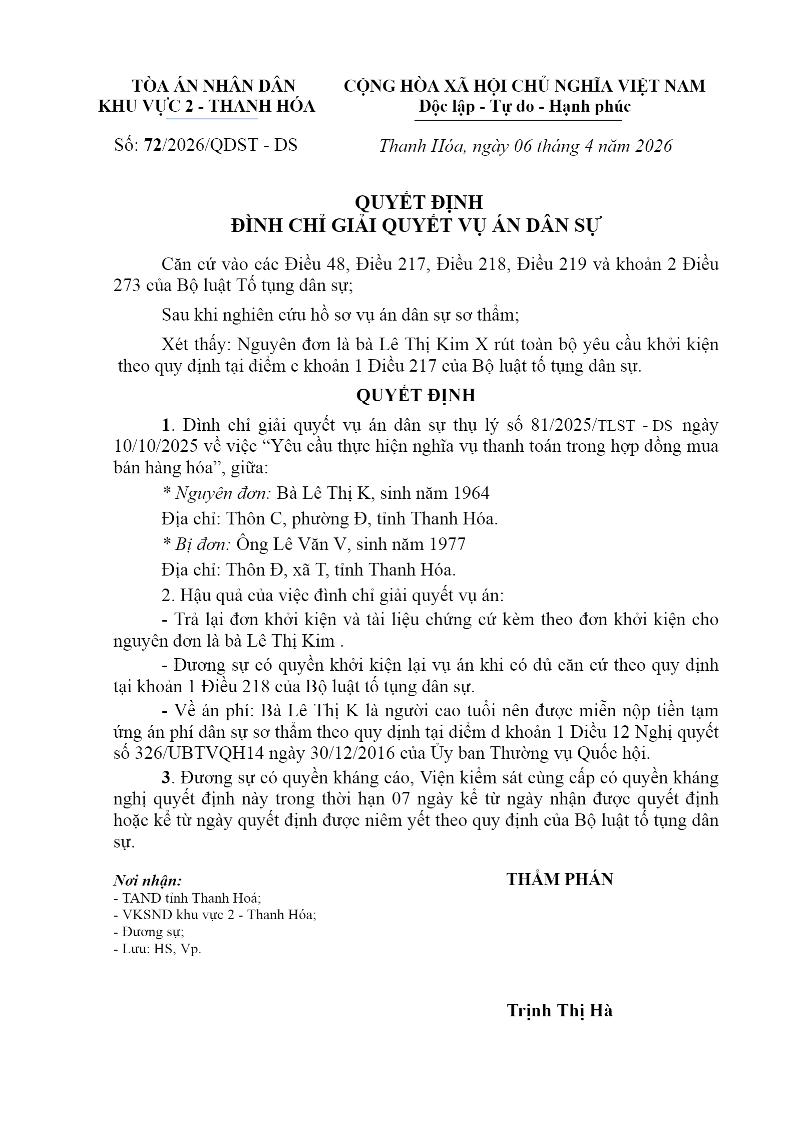 Quyết định số 72/2026/QĐST-DS ngày 06/04/2026 của Tòa án nhân dân khu vực 2 - Thanh Hóa, tỉnh Thanh Hóa về tranh chấp về quyền sở hữu và các quyền khác đối với tài sản