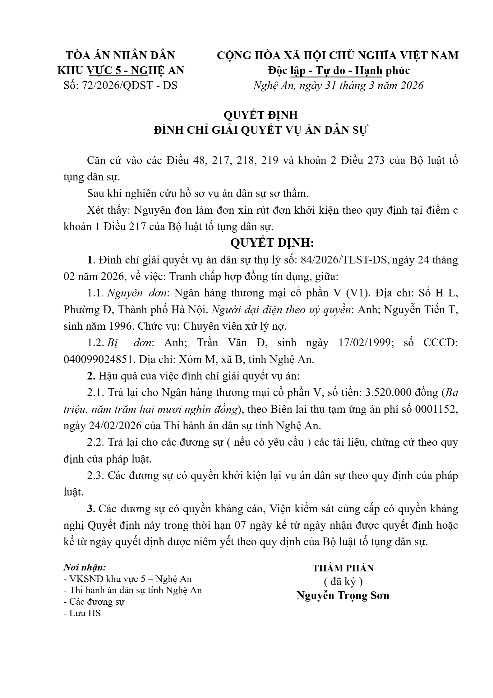 Quyết định số 72/2026/QĐST-DS ngày 31/03/2026 của Tòa án nhân dân khu vực 5 - Nghệ An, tỉnh Nghệ An về tranh chấp hợp đồng tín dụng